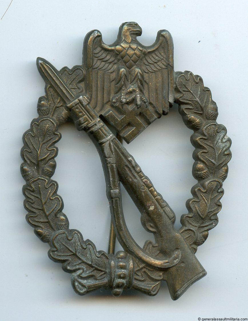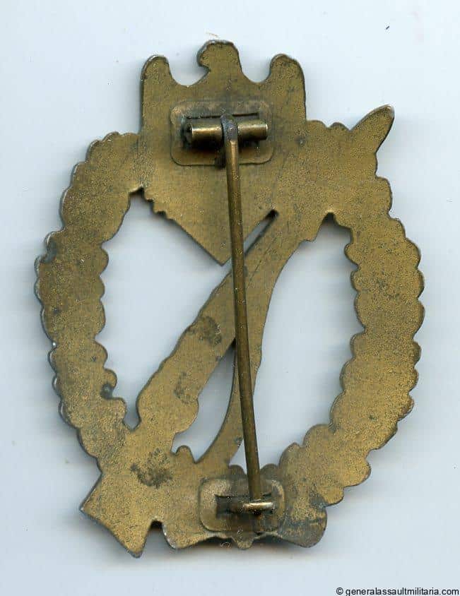 Infantry assault badge in bronze – Pillow crimp. Mid to late war solid zinc IAB with so called “pillow crimp” style crimp and bronze finish. Remains in lightly worn condition with most of the bronze finish still present and the setup still tightly crimped. Most likely produced or distributed by B.H. Mayer due to other badges that have been found with the L/18 mark in this style crimp. Very uncommon bronze grade.