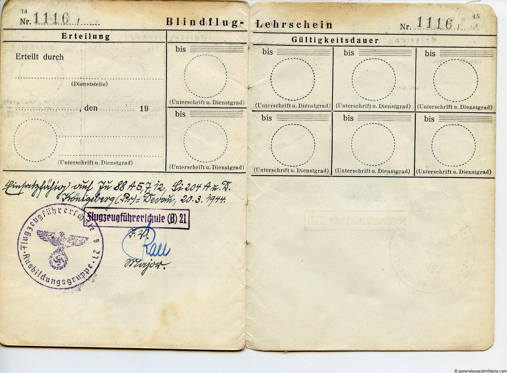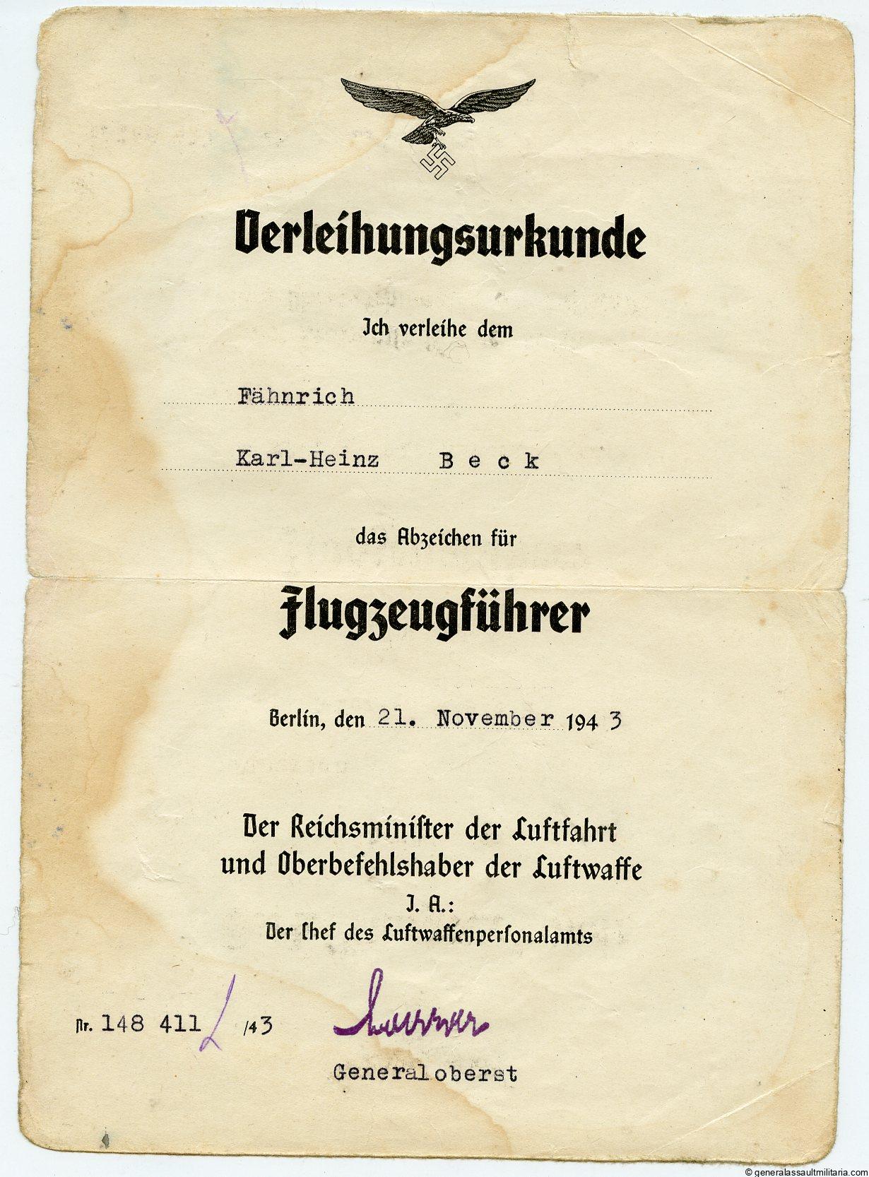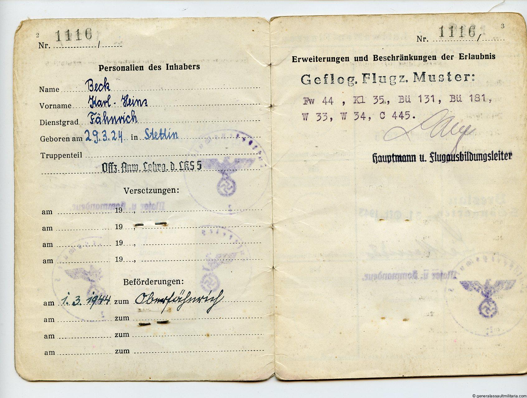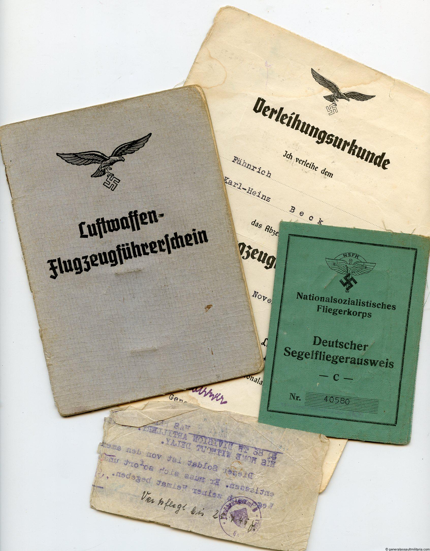 Small Pilot set to Karl Heinz Beck. Contains Beck his pilot badge award document A5 size from 1943 with normal age and wear. His NSFK green ID from when he was a child and his “Flugzeugfhührerschein”(pilot ID). Shows some entries with the planes he flew. Also present is a small leaflet about his release from as POW from the US forces. Interesting little set