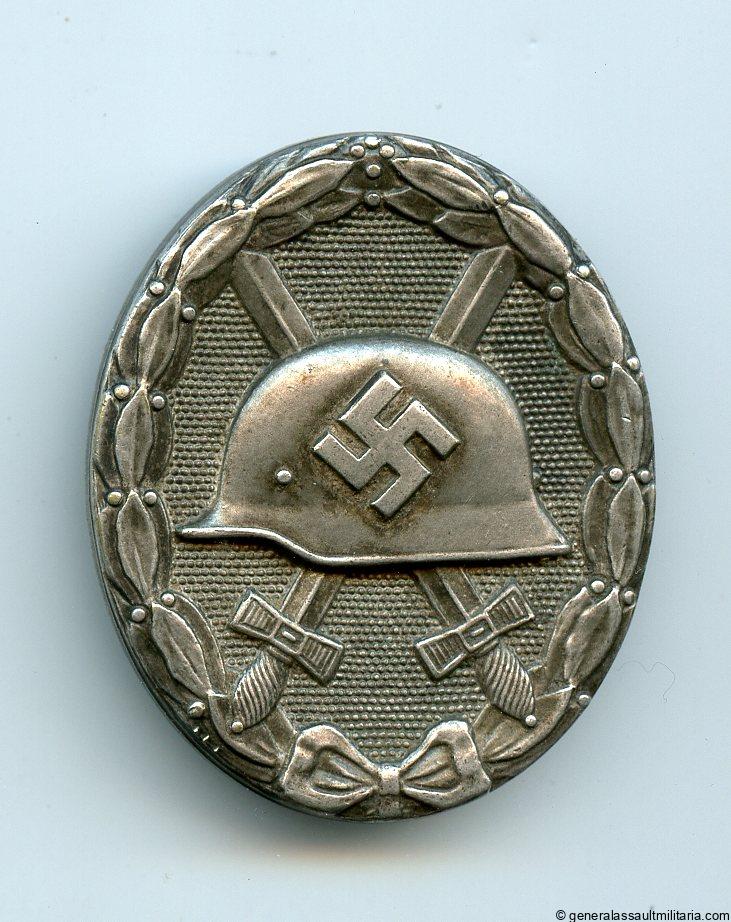 Wound badge in silver – Hauptmünzamt Wien. Early war solid tombac ‘verwundetenabzeichen’ with silver plated finish and typical Hauptmünzamt design. Remains excellent very lightly worn condition and still all the silver plating intact. Shows a light silver patina on both sides.