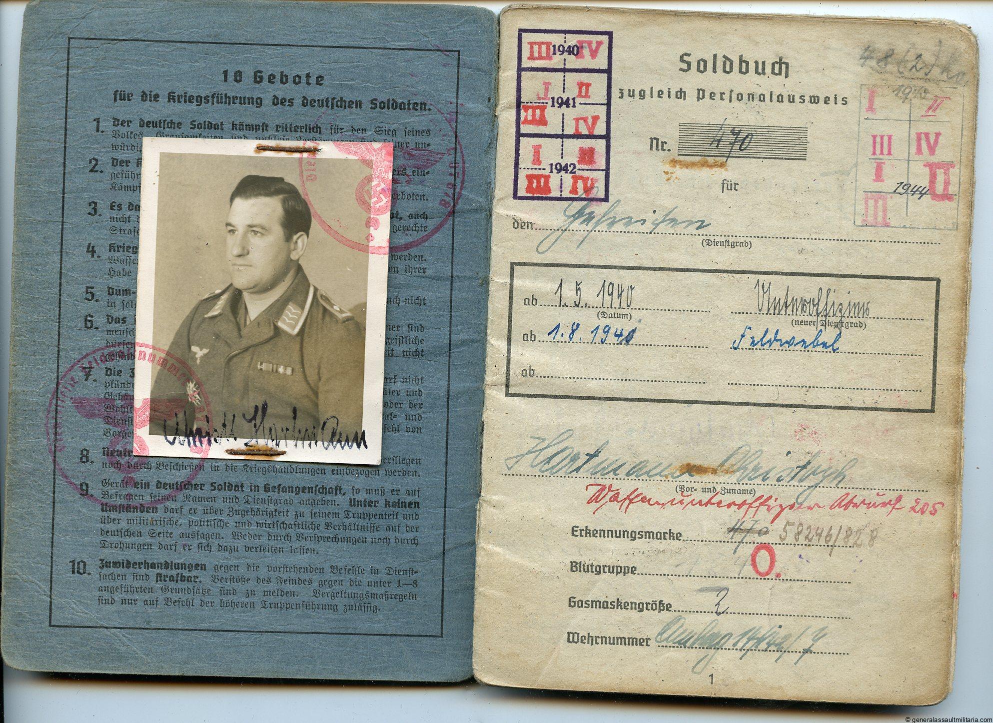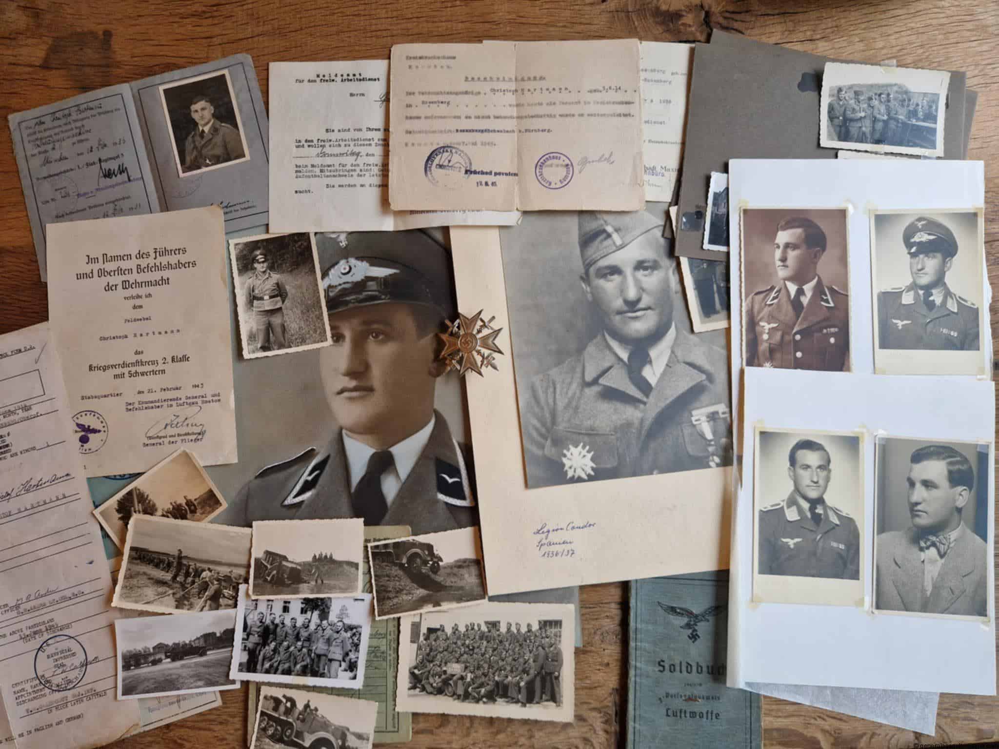 Spanish cross in silver grouping too Christoph Hartmann. Hartmann was with the Legion condor Flak unit before ww2 and was awarded the spanish cross in silver, along with a few more Spanish awards all nicely added to the soldbuch. The only award document present is the later KVK2 he was awarded during the war. Included in the grouping are a few pictures, portraits of him wearing the ribbon bars, medals and the exact rare 900 unknown maker variant awarded cross. The soldbuch is complete, nicely filled in and shows him waring his Spanish cross and ribbon bar with Spanish awards. Very special is the large portrait taken after 1939 with the Spanish uniform, something rarely seen. Two more postcard size portrait show him wearing the Spanish cross in silver on his German uniform.