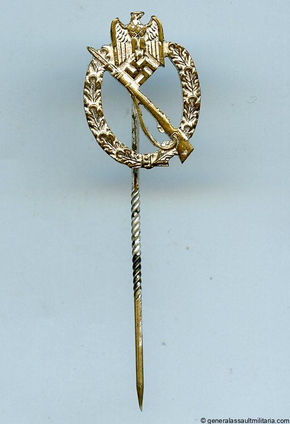 2.1cm infantry assault badge silver stickpin. Very uncommon large size tombac miniature with with thin silver finish. Remains in lightly worn condition with a great look, only the first time we had this type for sale.
