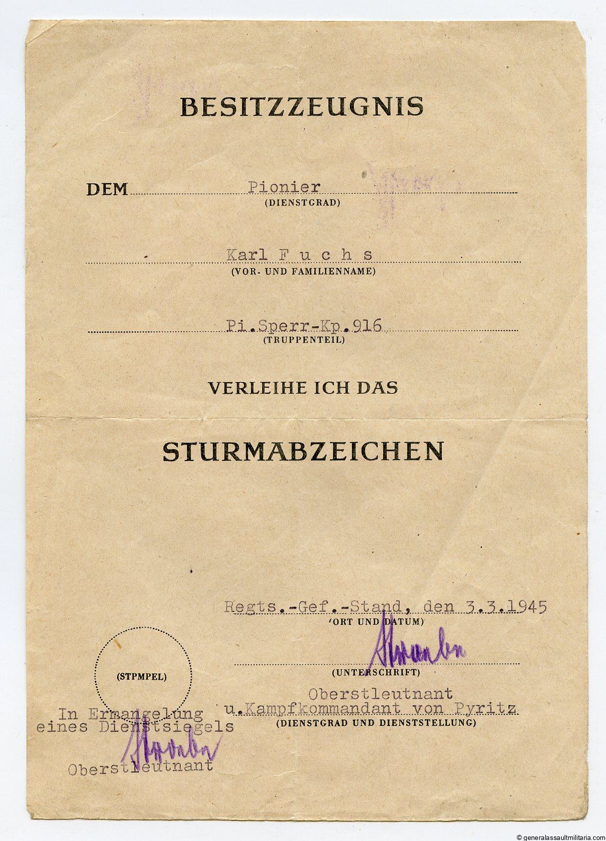 Award certificate General assault badge Pi. Sperr-kp 916 Kampfgruppe Pyritz. Interesting very late war document to Pionier Fuchs who was with the Pionier Sperr-Kompanie.916. There was no stamp available so they double singed it.