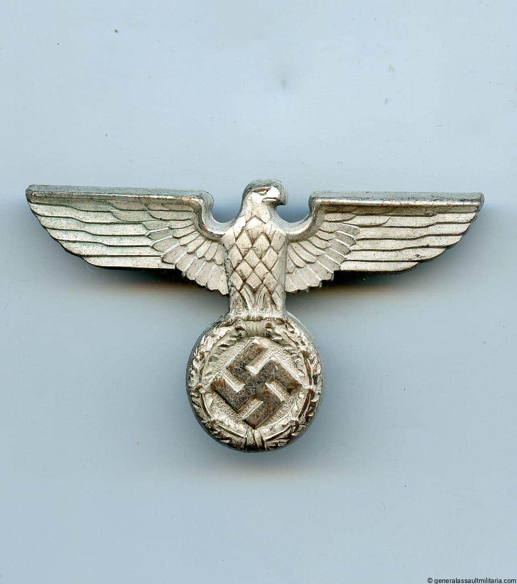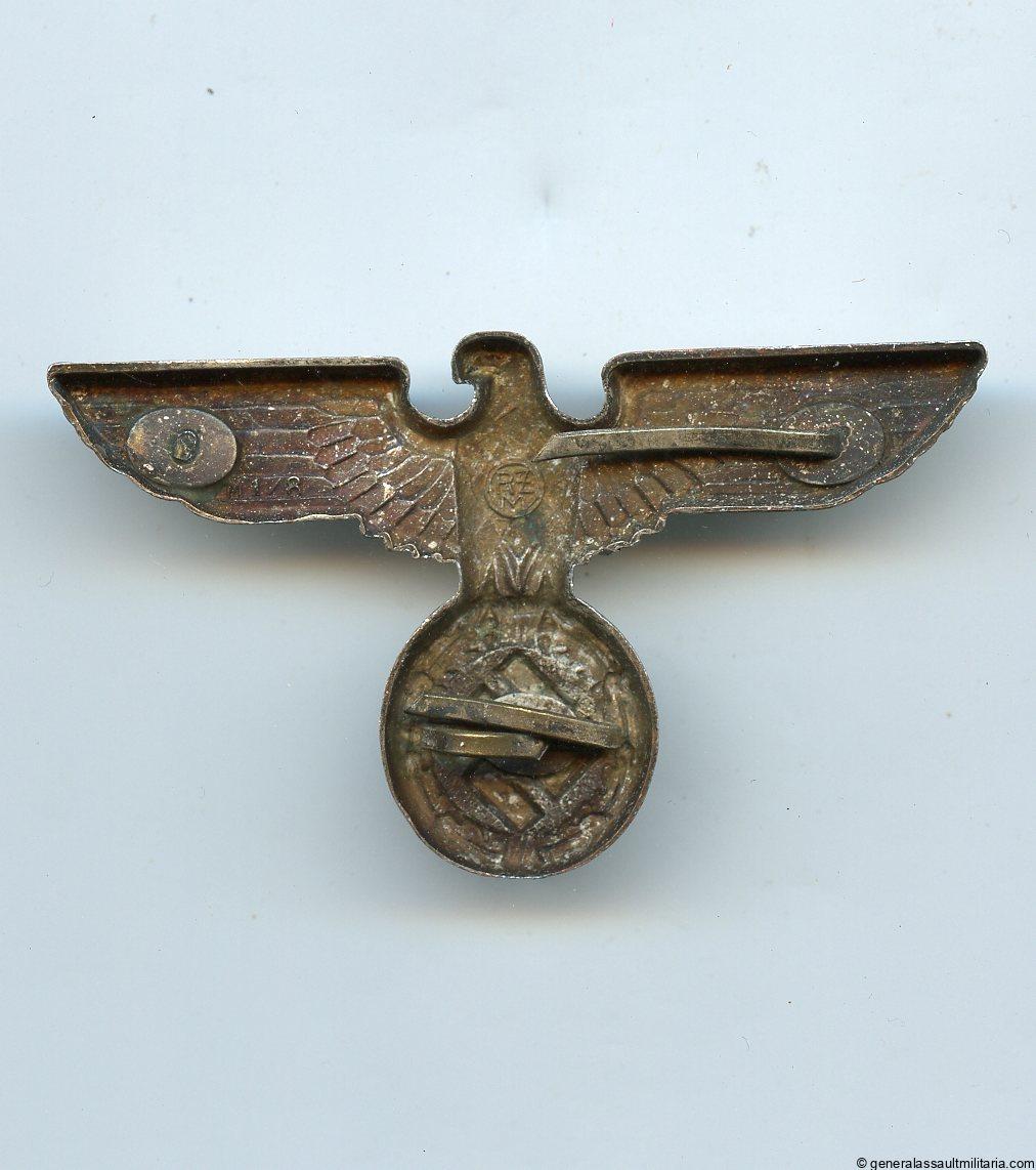 large political cap eagle – RZM M1/8. Early pre war cupal eagle with silver finish on the front and 4 prong setup, with Wagner Pforzheim RZM mark. One of the 4 prongs broken besides that unworn.