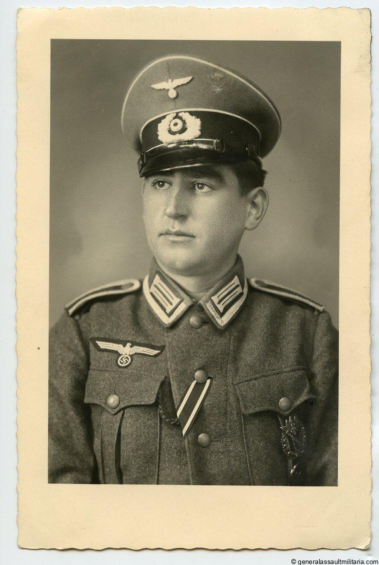 Heer portrait with IAB in wear. Excellent sharp photo, postcard size, Mimosa portrait paper, Atelier stamp on the reverse Eisleben Adolf Hitler str. Album removed. With Ek2 ribbon, IAB and 1st pattern wbb in wear. Small indent on the visor cap but besides that top condition.