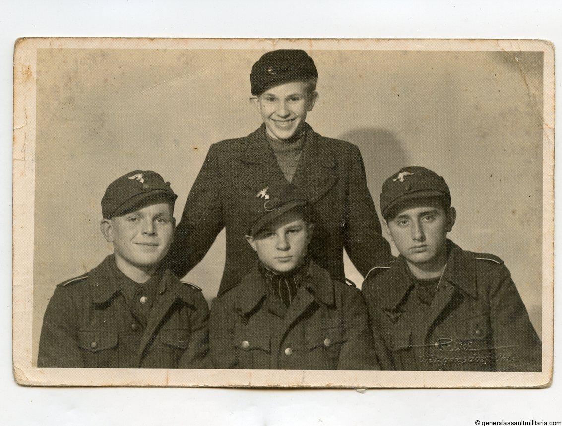 Rare Hitler youth Flak helper group portrait. Excellent studio portrait of 4 young boys with Luftwaffe Flakhelfer uniforms. Postcard size, unmarked portrait paper with Wittgendorf Atelier stamp in the corner. Some storage age but very sharp with good details.