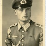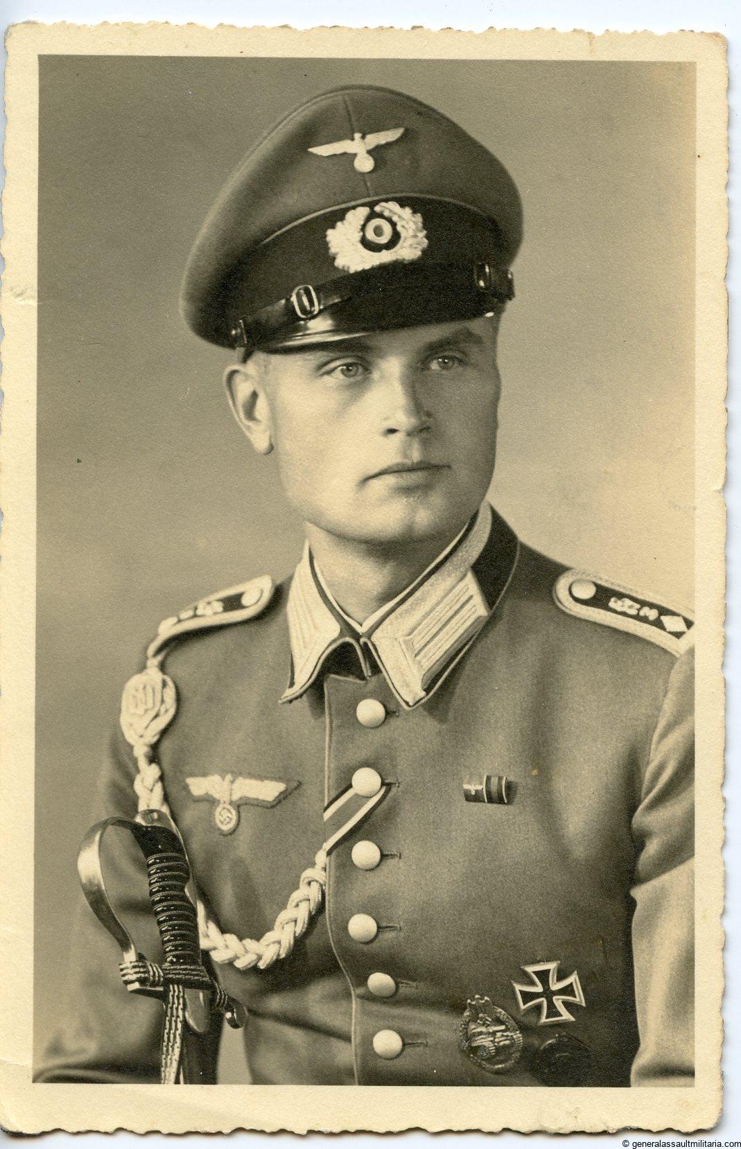 Heer Panzergrenadier Waffenrock portrait with Ost medal and 4 year service medal feldspange, Ek1, Wound badge in black, Early Schickle PAB in bronze, ek2 Ribbon, lanyard and heer sword. Sharp and cleaning looking portrait with only slight edge wear. Stamped with the Atelier stamp at the back and was album removed at some point. Top portrait!