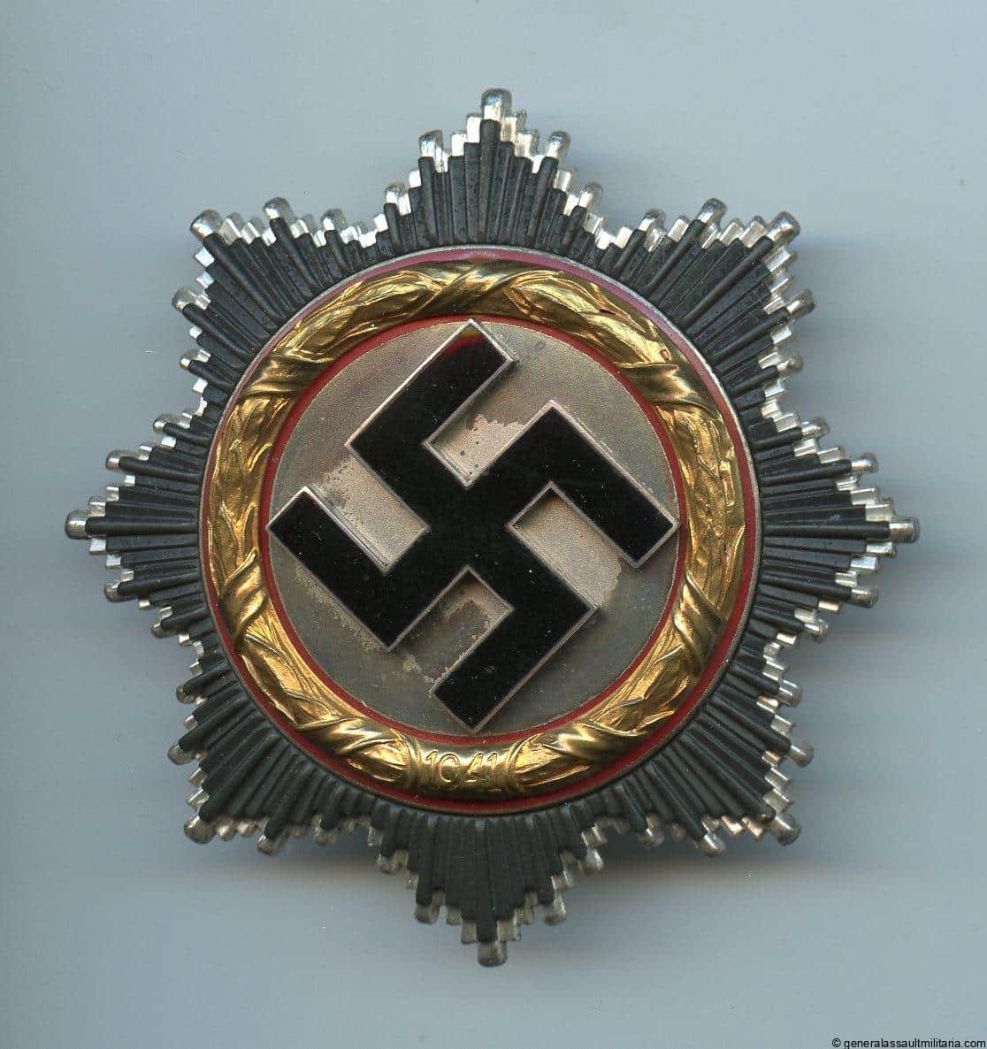 German cross in gold – C.F. Zimmermann, Pforzheim. Mid to late war cupal backplate 20 pin marked “Deutsches Kreuz in Gold”. Remains in fully unworn condition with still perfectly gilded cupal wreath and full black outer start burst. The enamel shows no wear and the white silver plated backing shows a typical dark patina from storage. Stunning textbook cross in excellent condition.
