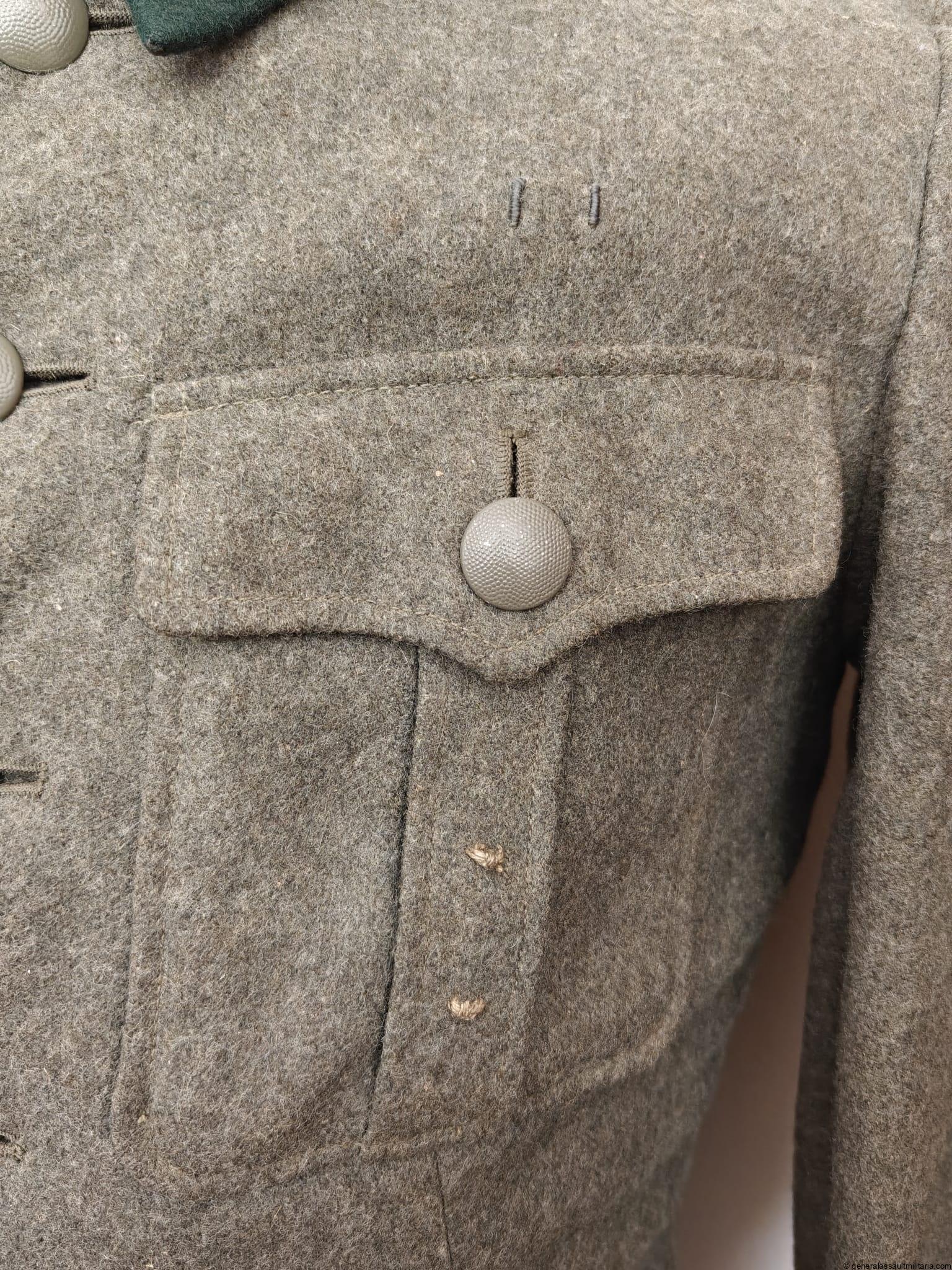 Heer infantry officers field tunic in good condition. This leutnants jacket has handsewn collar tabs and breasteagle to the jacket. This jacket has loops for a ribbon bar and a badge on the breast pocket. This jacket has been found together with the Heer infantry officers visor cap with fresh-air cocade ID: 36420.