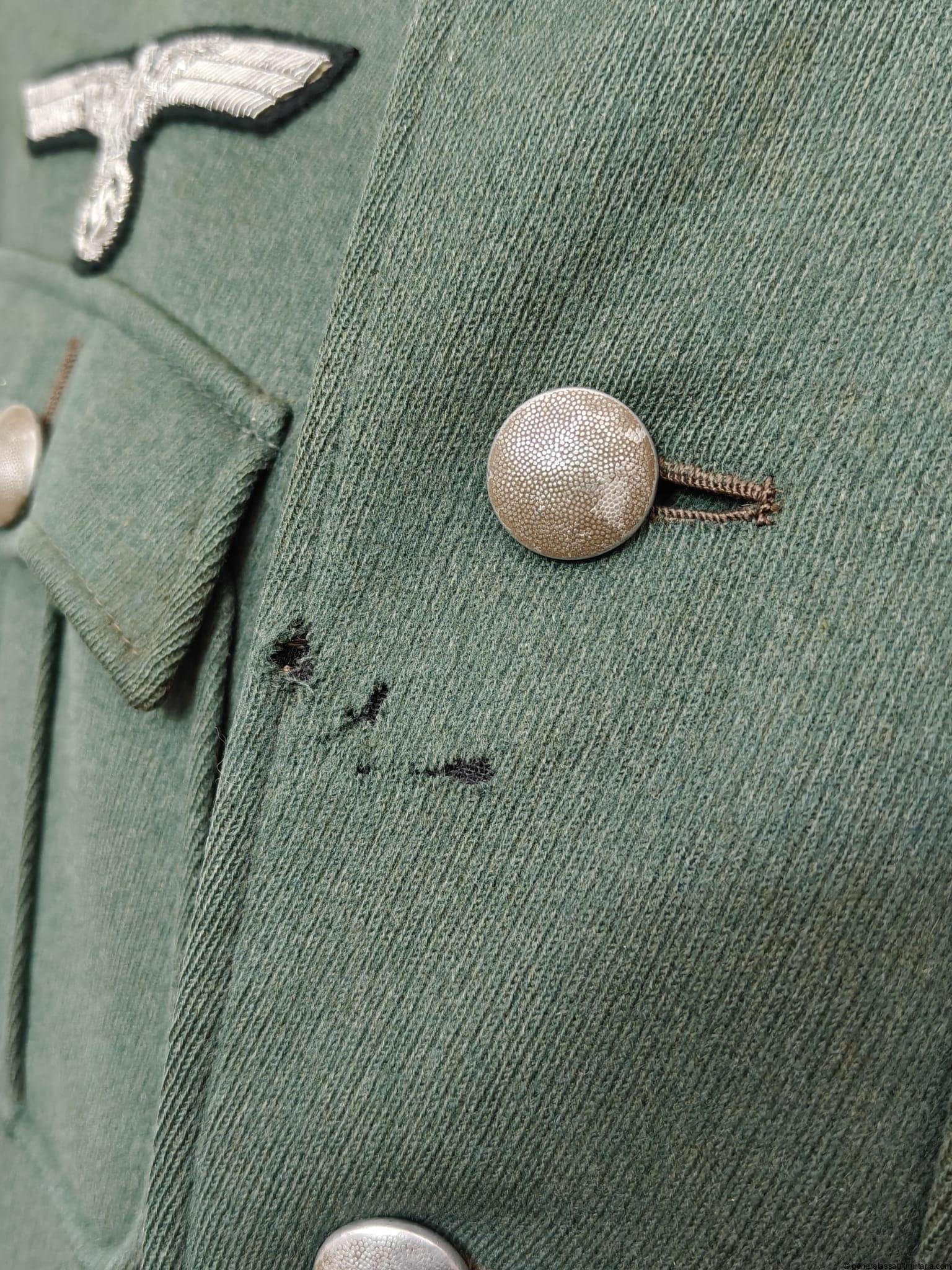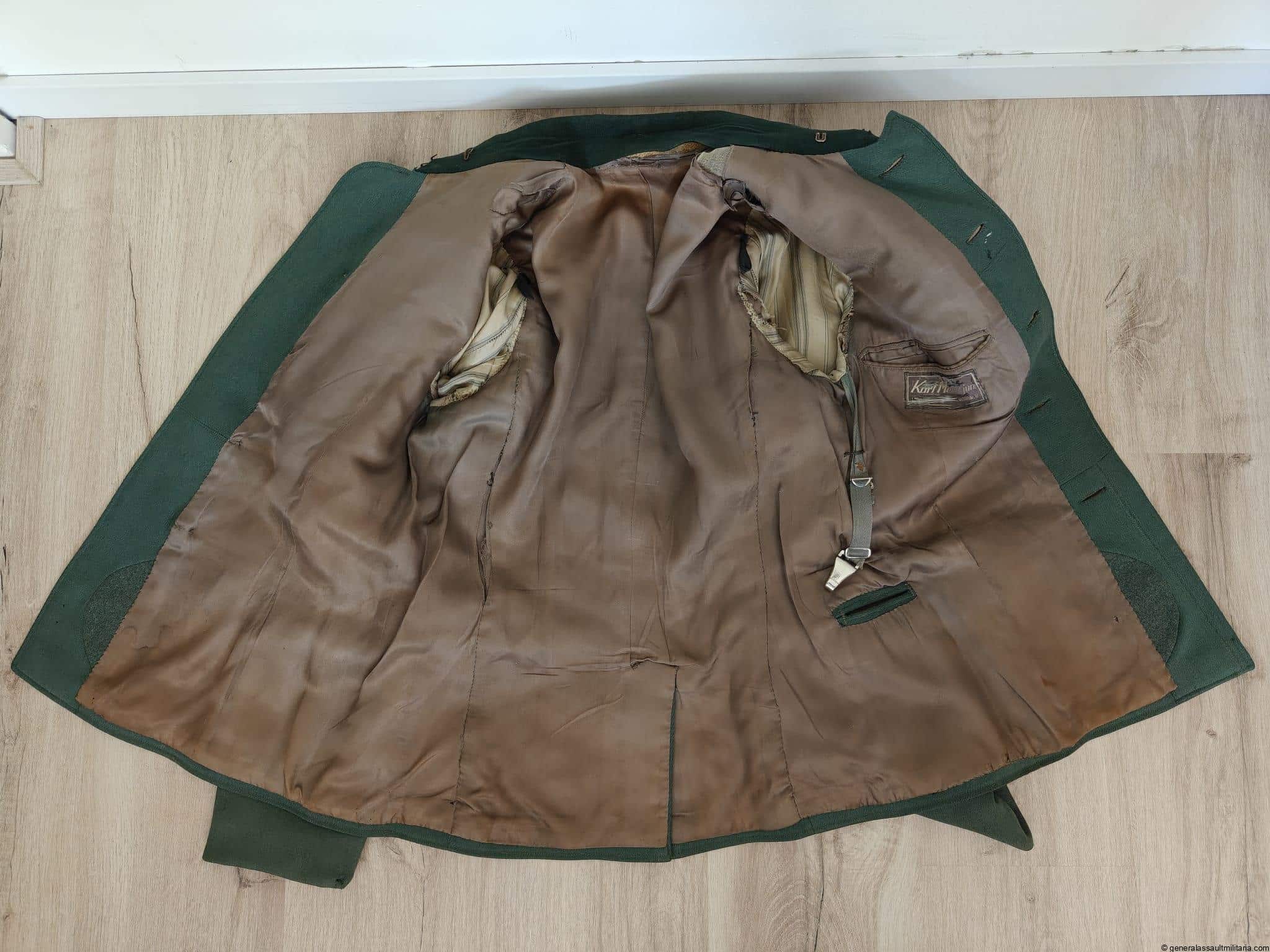 Heer Pioneer officers field tunic to a Hauptmann. Very nice jacket, in overall good condition but with some damage under a button, on the shoulder and a small hole on the right sleeve (see photos).Produced by Kurt Meier junior. Has loops for a long ribbon bar and a badge on the breast pocket.