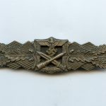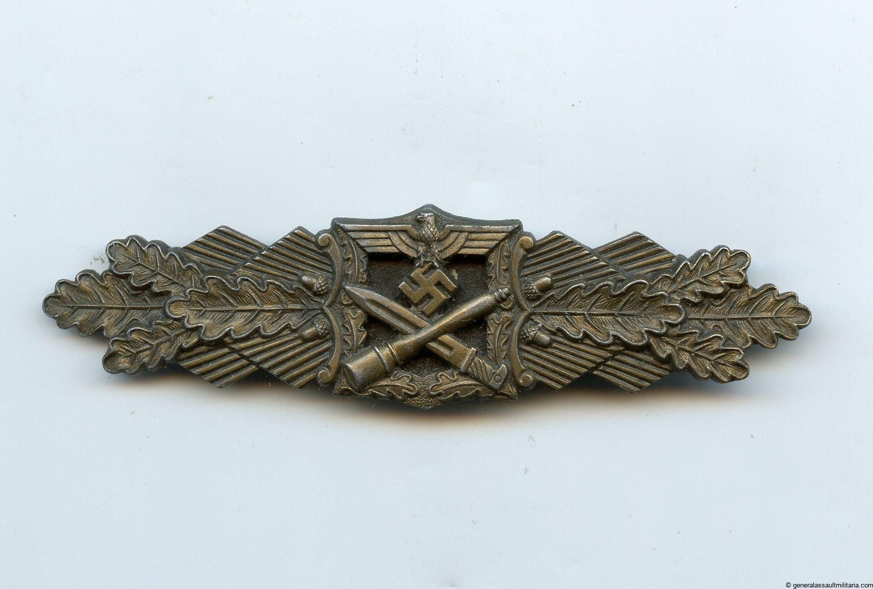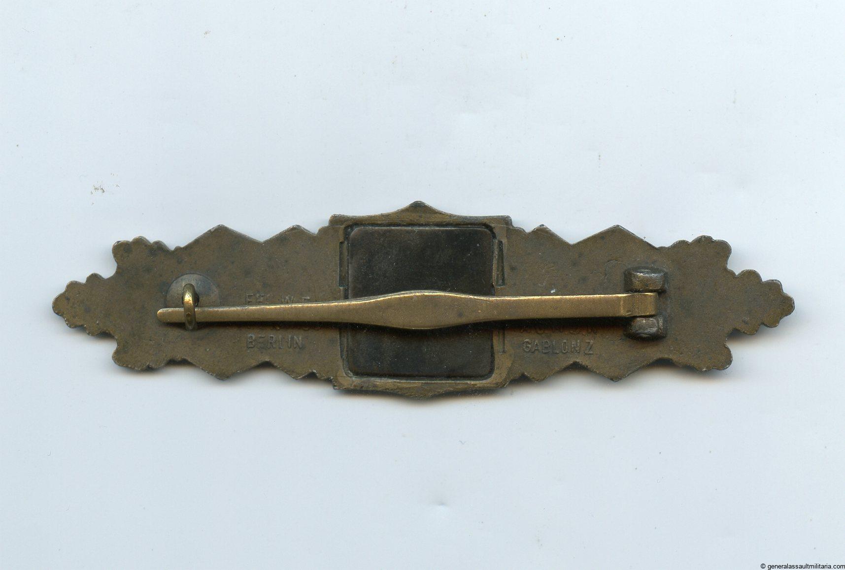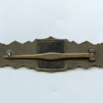 Close combat clasp in bronze – A.G. M.u.K, Gablonz. Zinc Muk clasp variant 1.3 with crimped catch. Remains lightly worn condition with clear signs of wear, overall the ccc has retained the bronze finish nicely. No damage or repairs on this good looking worn Muk ‘Nahkampfspange’.