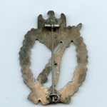 Infantry assault badge in silver – C.E. Juncker, Berlin. Solid zinc IAB with copper coating and silver finish on top. Remains in nicely worn condition and has a good part of the finish remaining. The badges shows very little of the base material and copper coating coming through on the worn parts. Slimstalk design IAB linked to Juncker. Some bright finish remaining on the wreath, eagle, swastika and back.