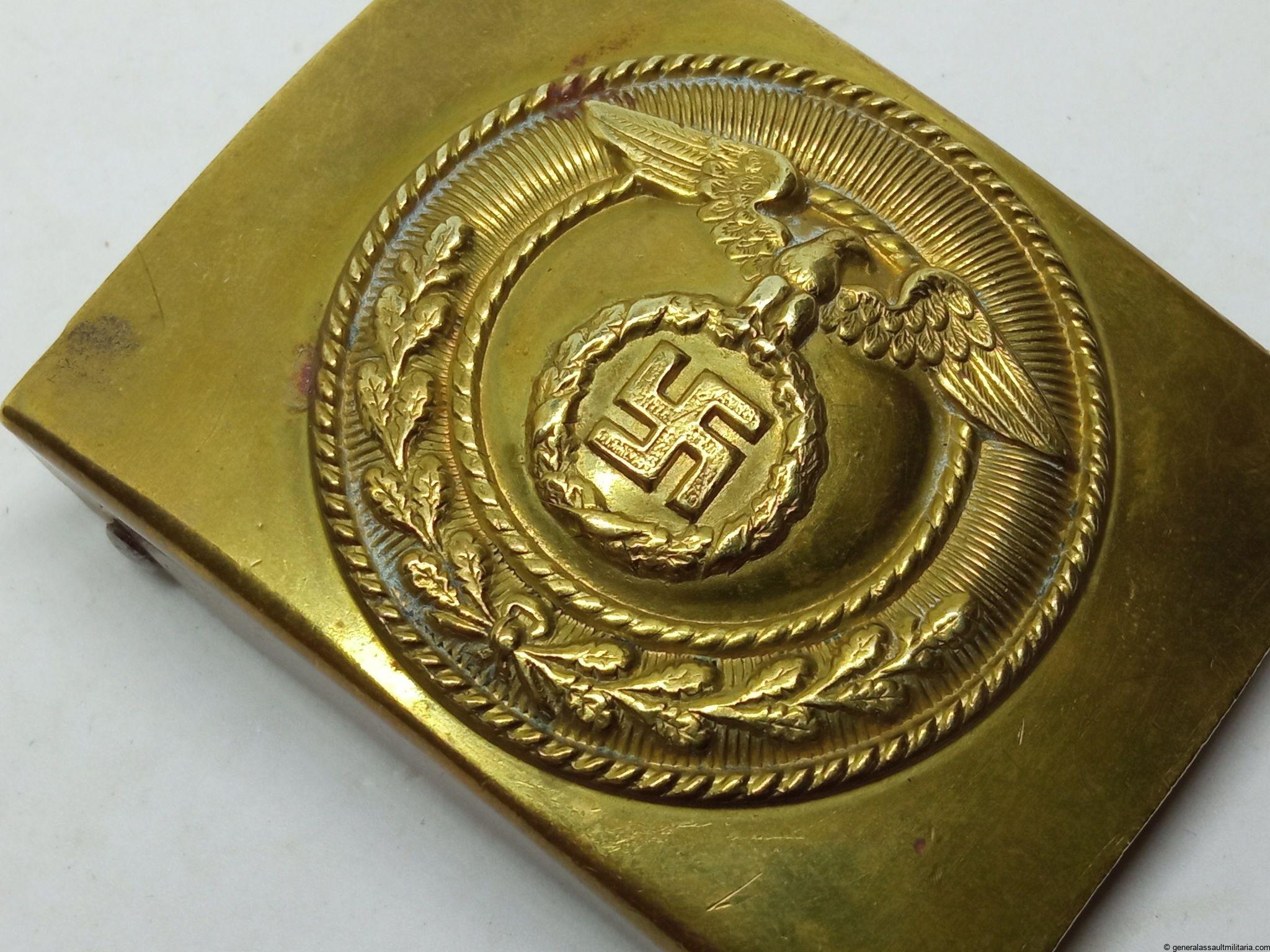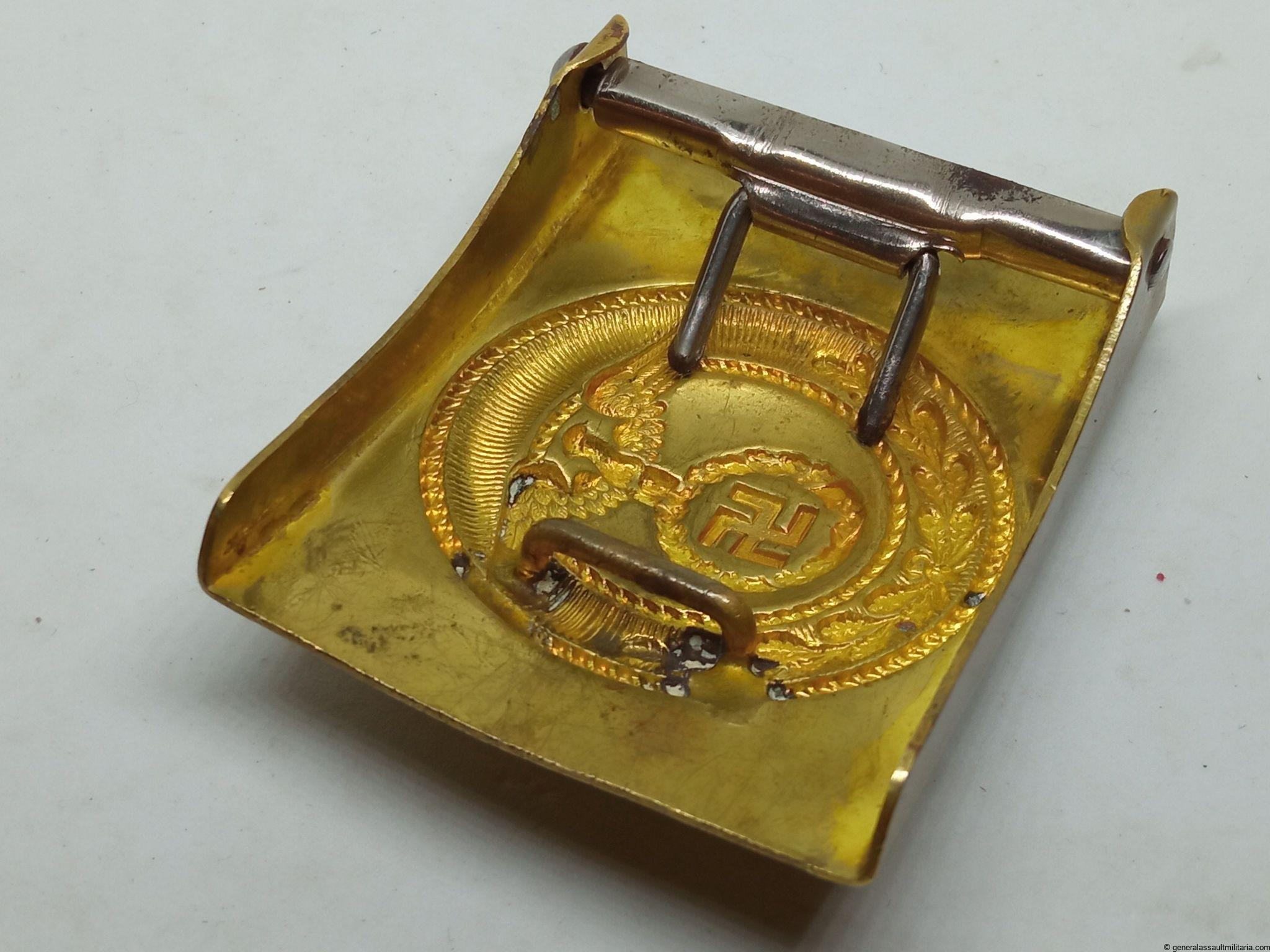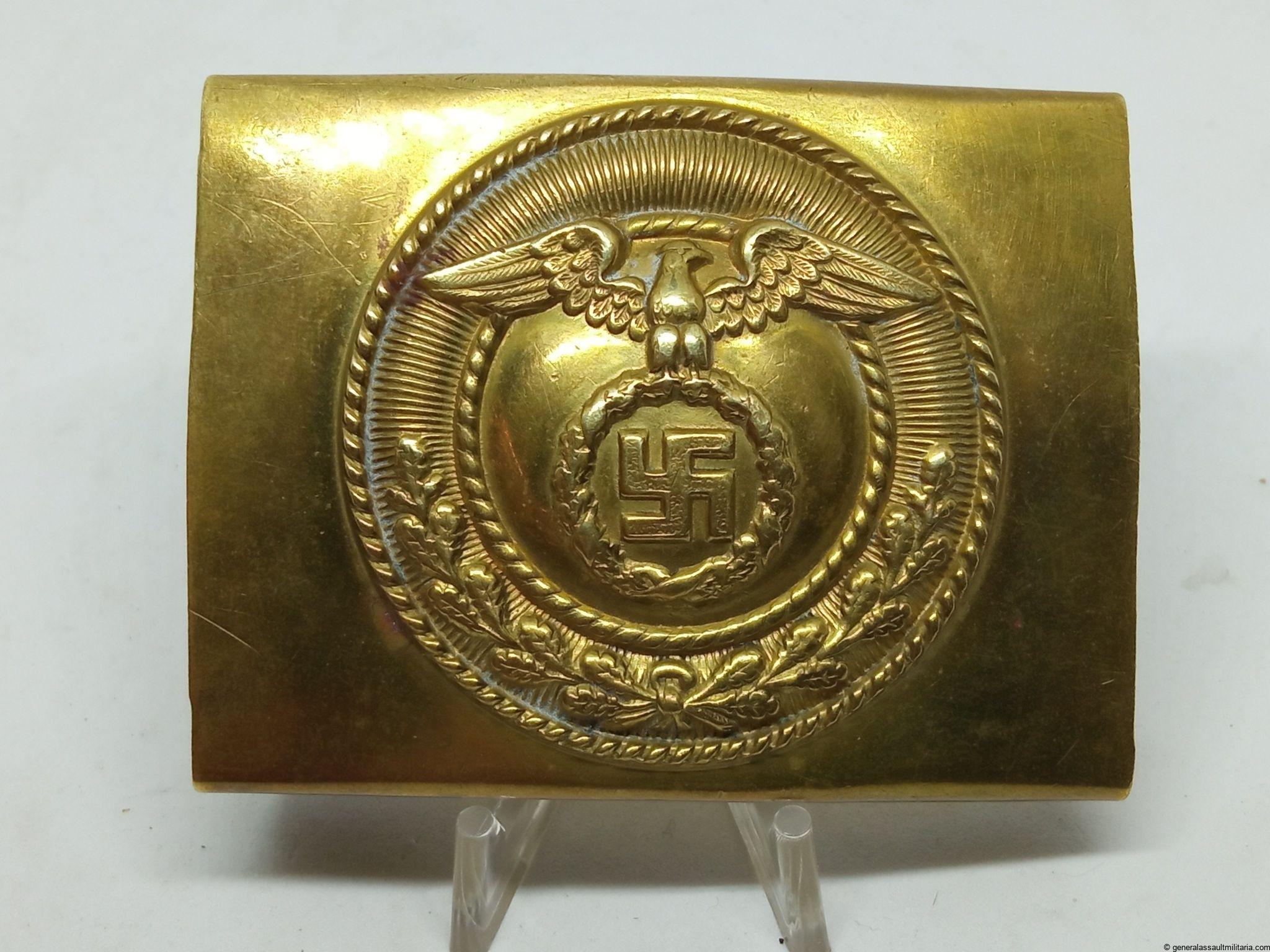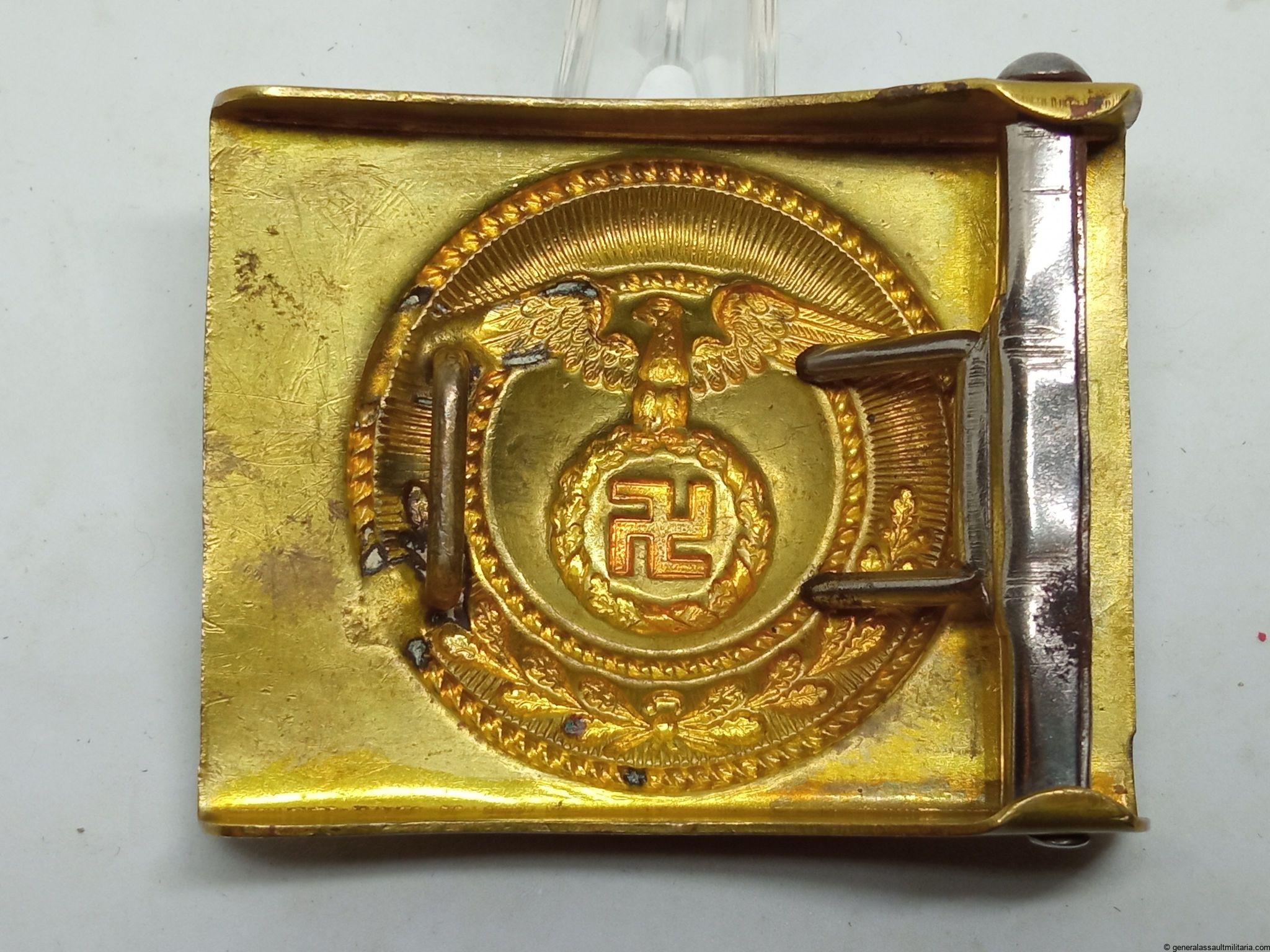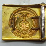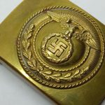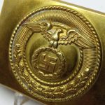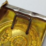 SA Buckle – early static swastika variant. Early tombac SA buckle by an unknown maker, so called static swastika variant. Remains in lightly worn condition and overall remains in hard to upgrade condition. Top example of a rare early SA buckle.