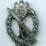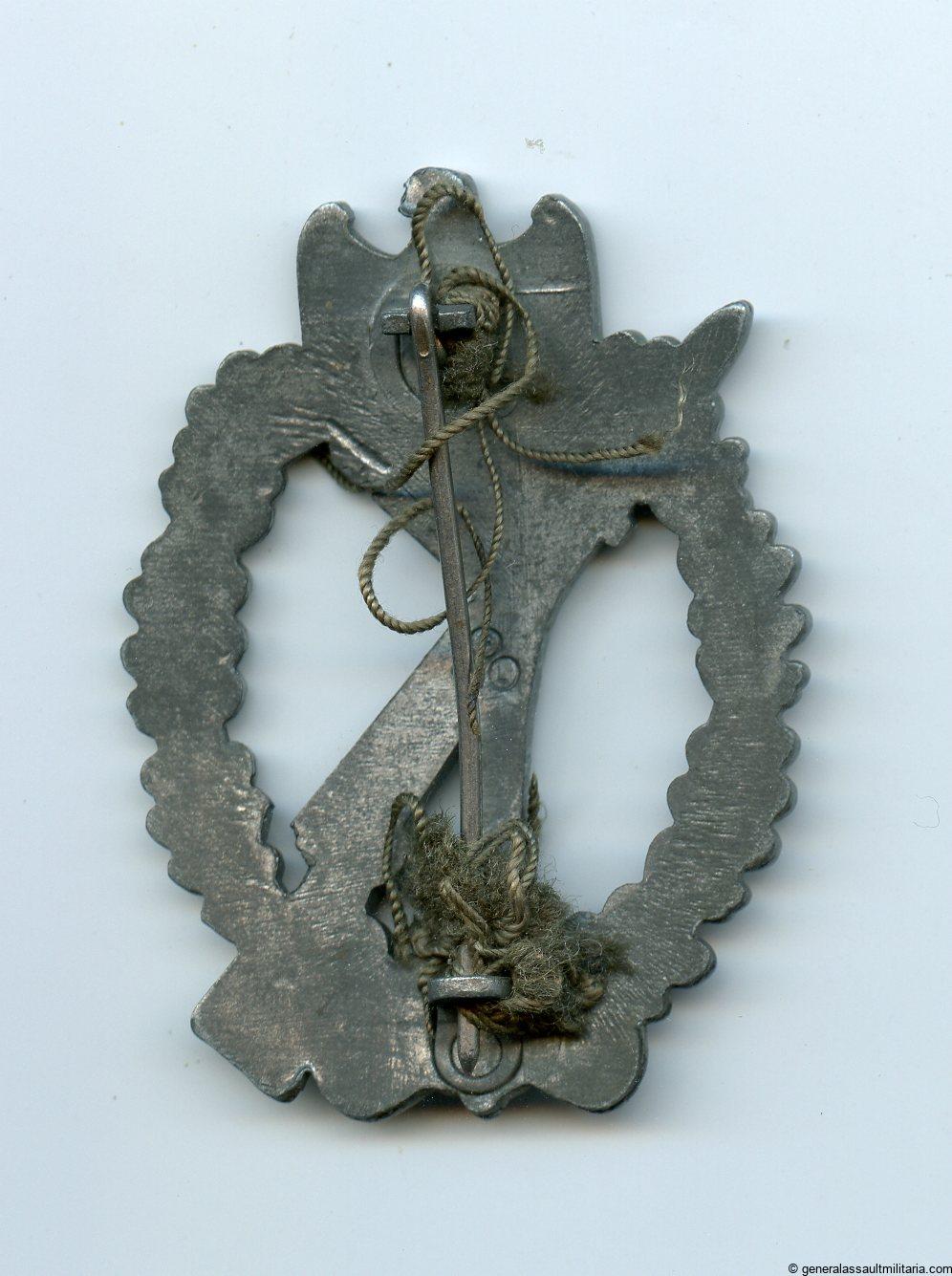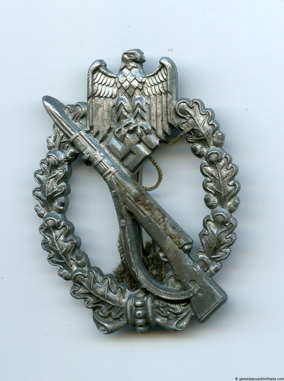 Infantry assault badge in silver – Friedrich Linden, Lüdenscheid. Late war slightly vaulted zinc badge with unique FLL style of hinge and catch crimping, maker marked FLL. Heavy badge in nicely worn condition, with a good part of the silver finish remaining. The badge shows some more wear on the K98 but overall remains bright and honest worn.