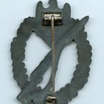 Infantry assault badge in silver – Vienna design “scooped K98”. Mid to late war semi-hollow zinc badge with ‘Vienna design’ front. Setup is soldered in a recessed area. Remains in lightly worn condition and has all the thin silver wash finish fade. Uncommon IAB variant.