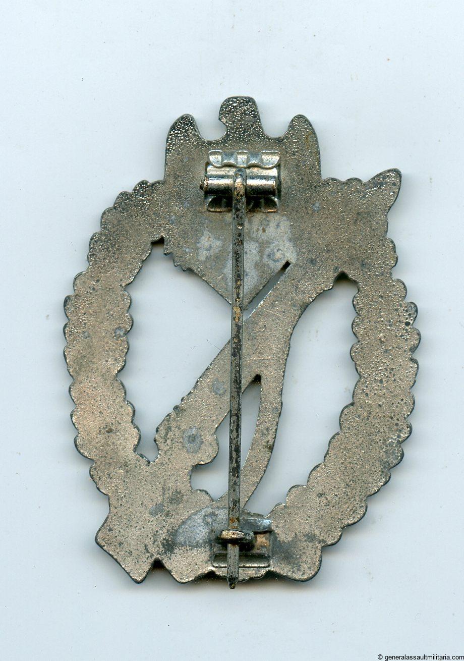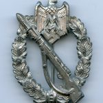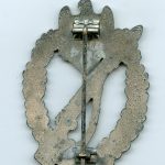 Infantry assault badge in silver – Gottlieb Wagner, Idar-Oberstein. Late war IAB with waffle crimp style setup and Idar-Oberstein design. Remain in unworn condition and has nearly all the finish still present. Very well preserved IAB that was found with Gottlieb Wagner packets in the past.