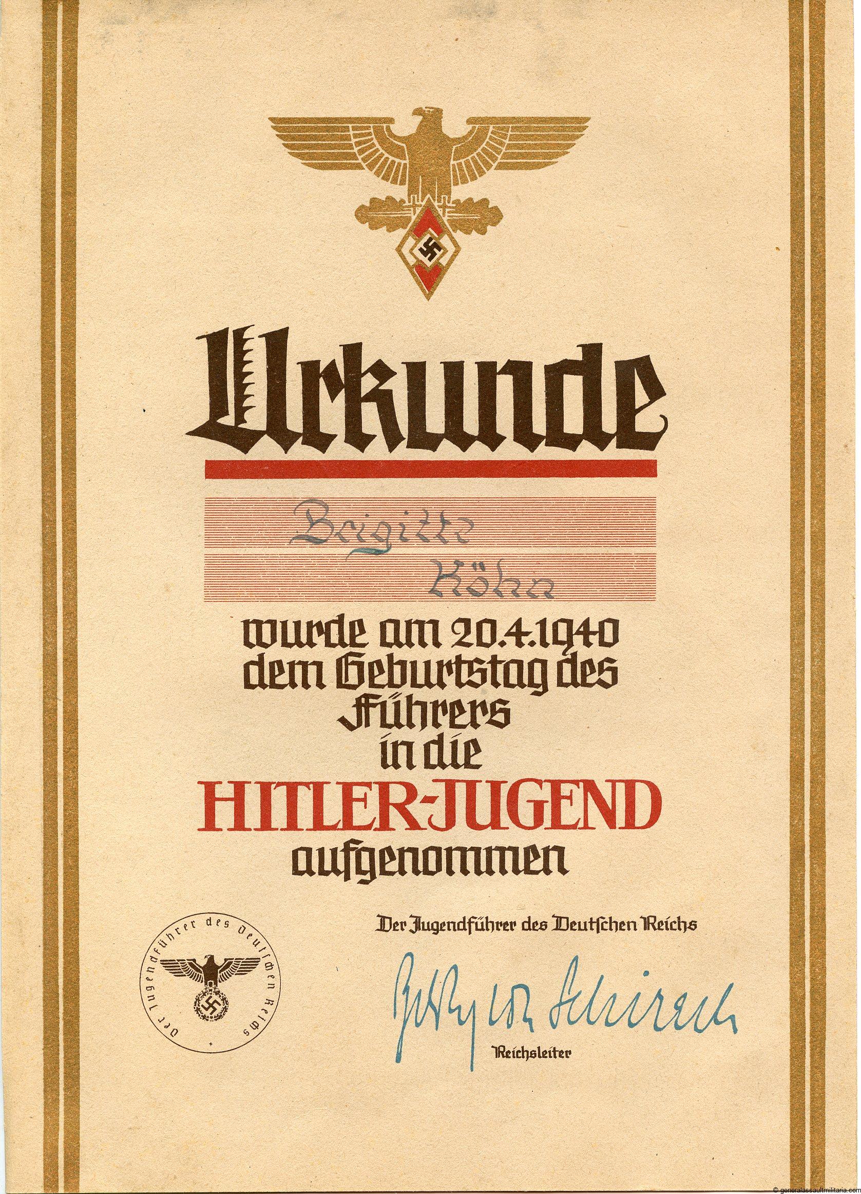 Hitler youth acceptance award document for a BDM girl. Remains in good condition and is made out of good quality paper, accepted on 20-04-1940. Facsimile signature from Baldur von Schirach.