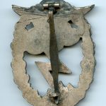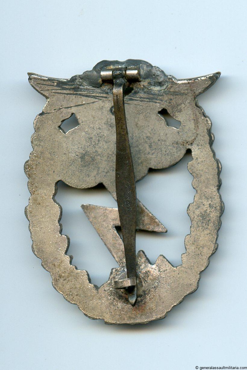 Luftwaffe ground assault badge – C.E. Juncker, Berlin. Early Erdkmapfabzeichen variant with wide pin setup and strengthened hinge. Remains in worn condition and was factory or field strengthened. Something that is often seen on Juncker LW GAB. Still has the original wide pin setup present.