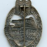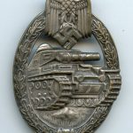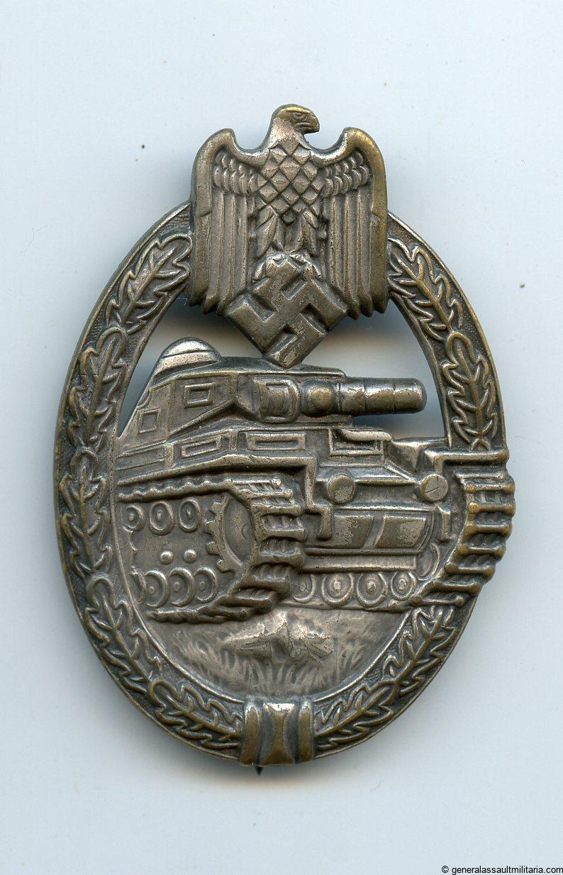 Panzer assault badge in silver – Otto Schickle, Pforzheim. Early war Schickle design variant in well worn condition and some of the silver plating worn down. The original nickel silver pin was replaced with a steel version at some point in time. Uncommonly encountered heavy version which is about 25-30% more heavy than the normal Schickle.