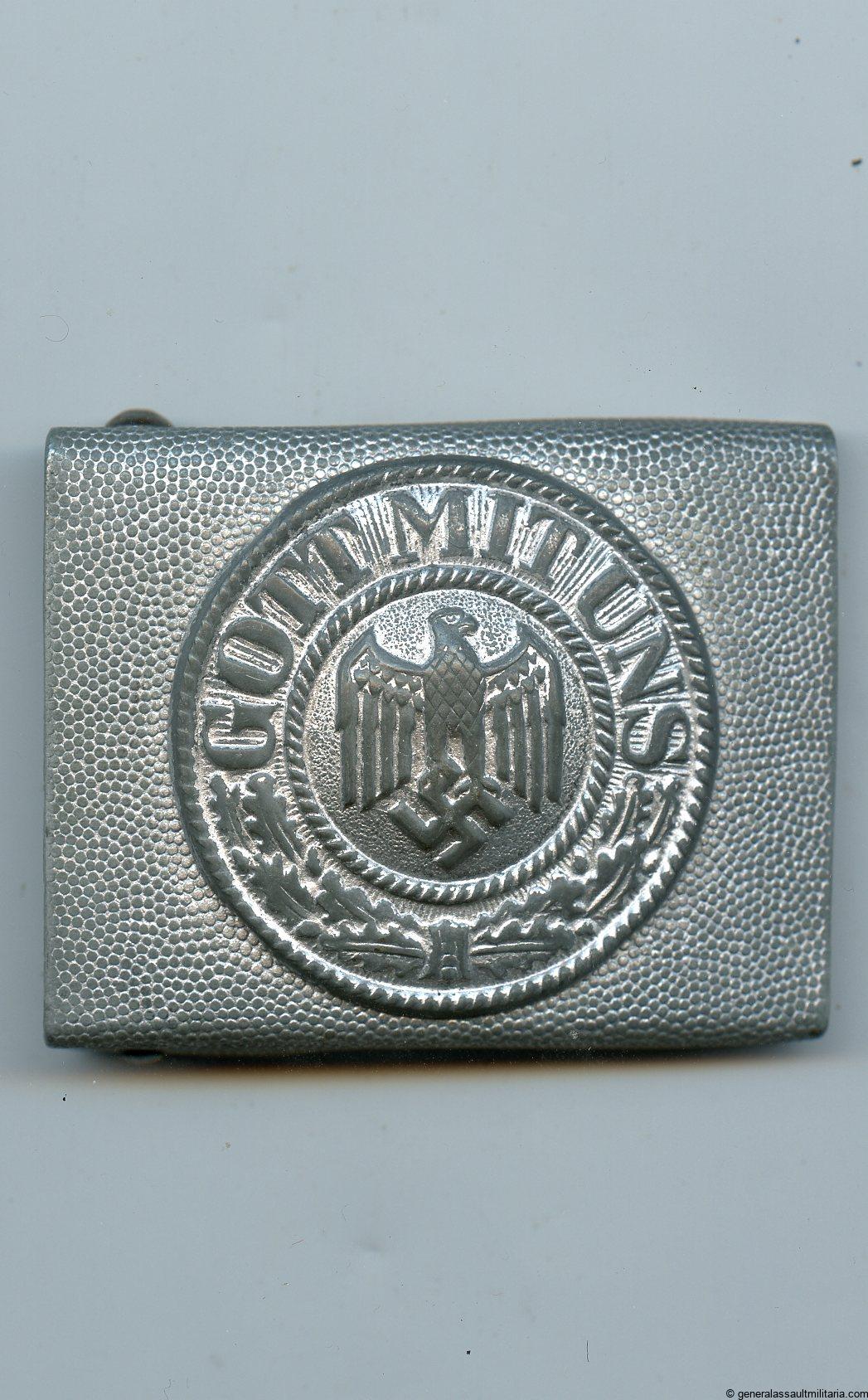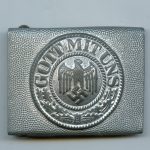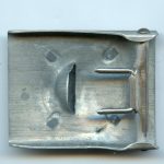 Heer parade buckle – Unknown maker. Unmarked late war zinc parade buckle with zinc attachment. Normally found in aluminum as an early war or pre war version. Remains well worn condition and shows the silver finish worn down on the front.