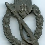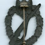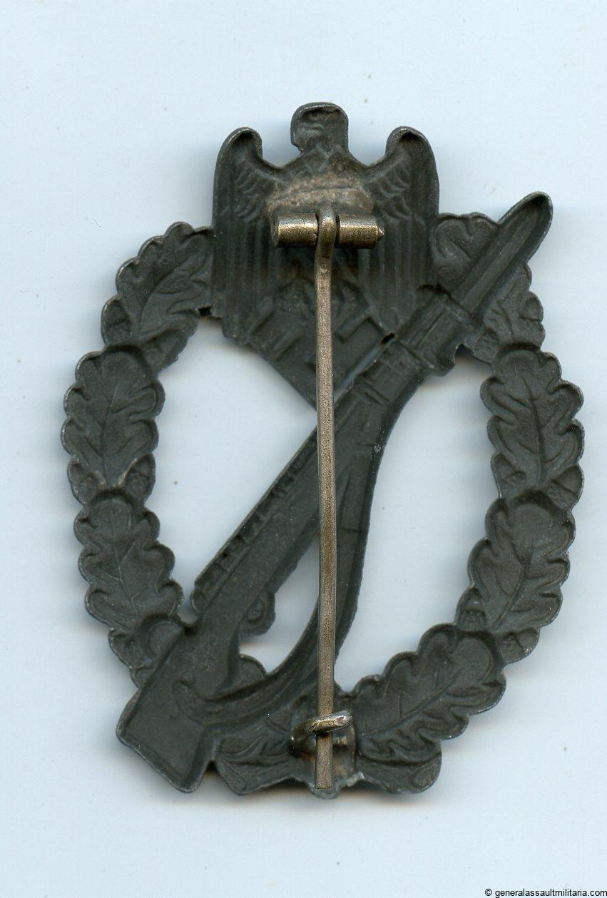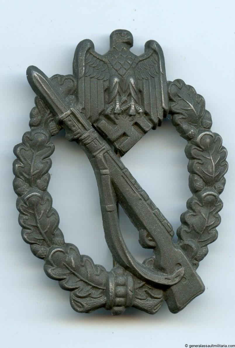 Infantry assault badge in silver – Assmann & Söhne, Lüdenscheid. Hollow zinc IAB with Assmann makers mark on the back of the k98 stock. Silver wash finish variant that has all its finish faded, but was only lightly worn giving it an almost fully dark grey look. A glimpse of the almost always missing finish can be seen on the setup and solder.
