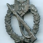 Infantry assault badge in silver – unknown maker ”pillow Crimp” Vienna design. Solid Zink construction with the very unique pillow crimp set up. A good, lightly worn badge with appealing detail. Not repaired with no damage. A good quality late war infantry assault badge.