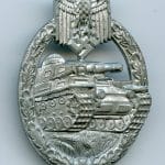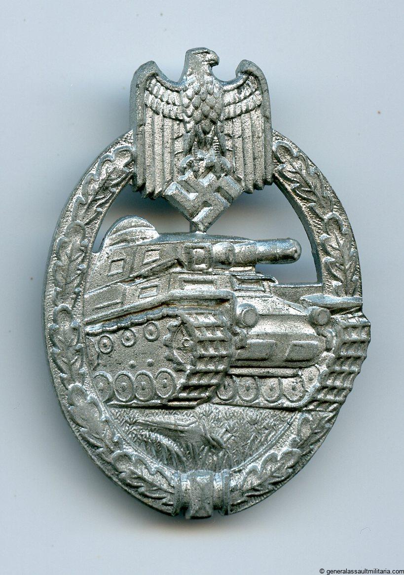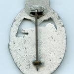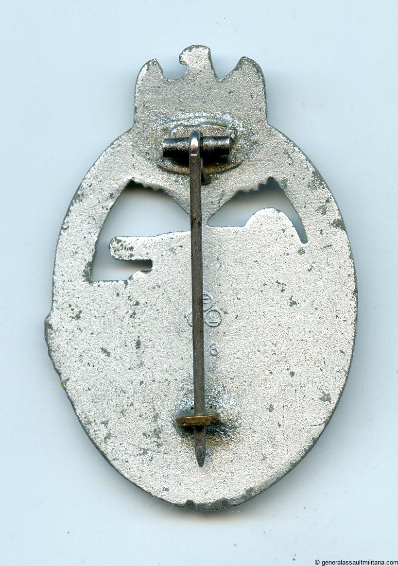 Panzer assault badge in silver – Friedrich Linden, Lüdenscheid. Zinc PAB with FLL design and FLL 43 makers mark on the back. Has a catch typically found with FLL produced badges and remains in lightly worn condition. Still shows most of the finish remaining and has a sharp look to it. More uncommon PAB in excellent condition.