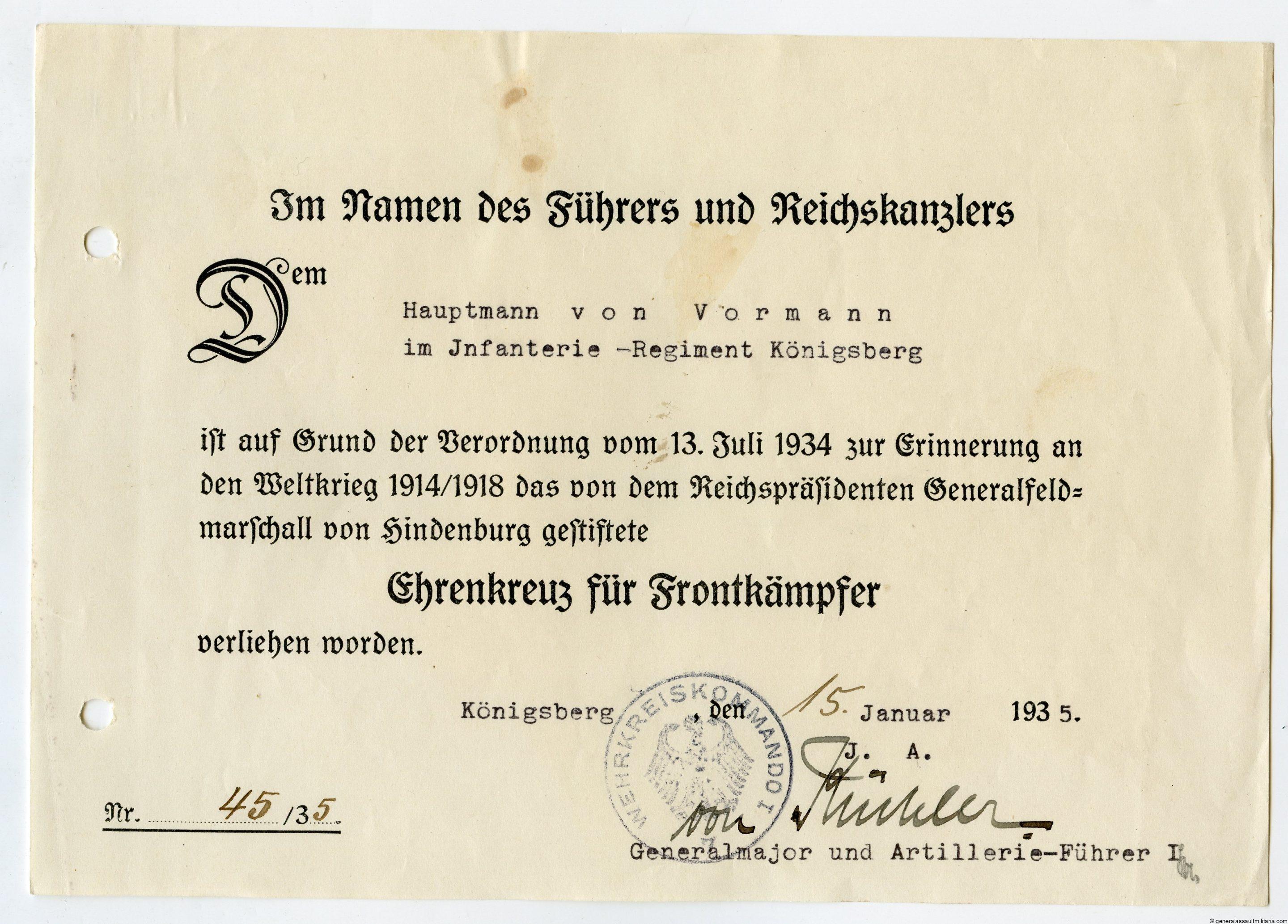 Ehrenkreuz für Frontkämpfer award certificate Knights cross holder Von Vormann