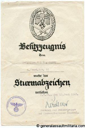 SOLD OUTGeneral assault badge award document