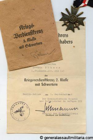 Small KVK2 with swords set to Severin Böhmer, 1./Flakschw.Abt. 410 (o)