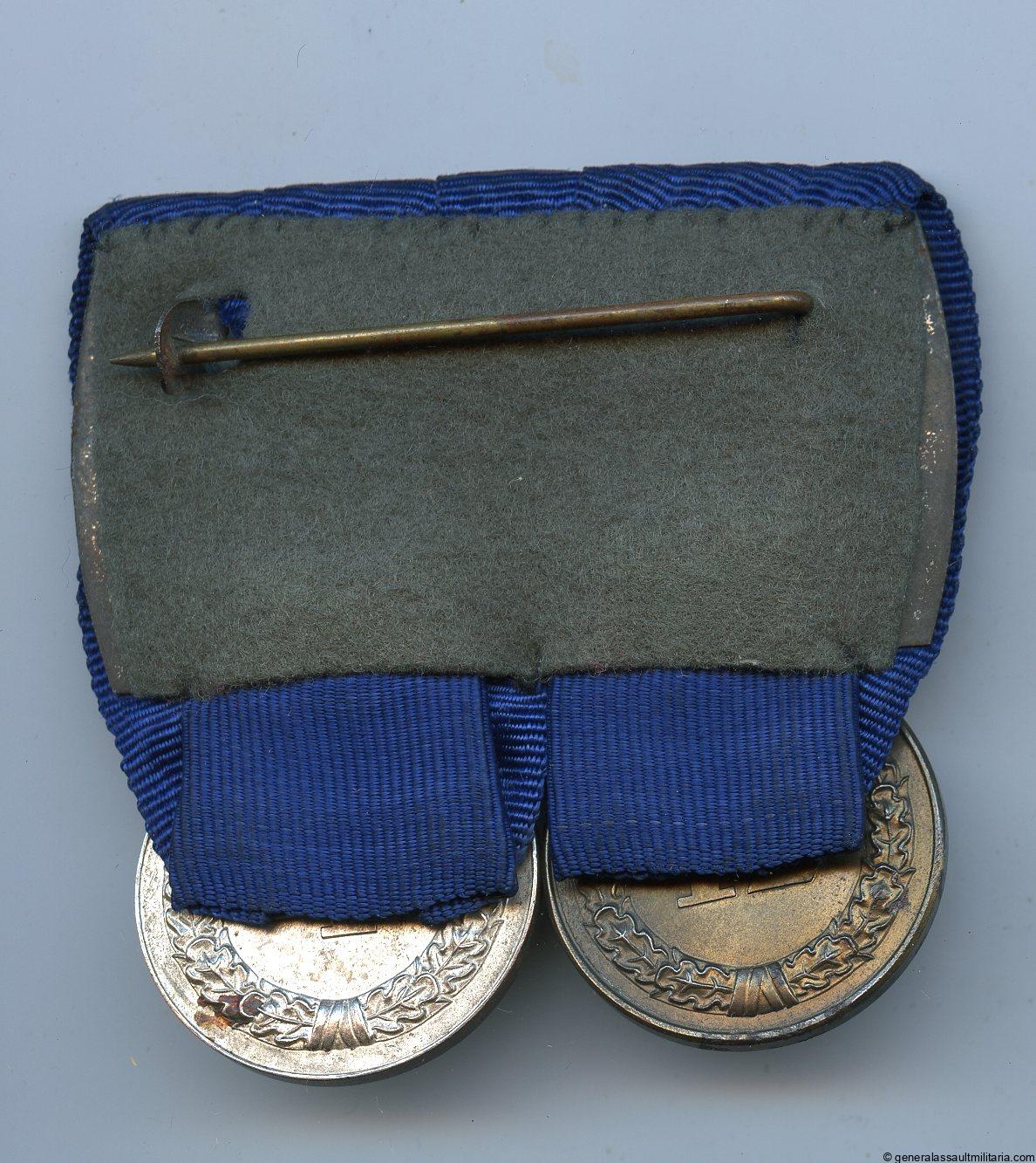 12y + 4y loyal service medal bar. Nicely mounted 4 + 12 year medals either for Luftwaffe or Heer, with both the attachment eagles missing. Remains in lightly worn condition with both the steel construction medals fairly well preserved. The bar is made up with green back cloth and shows some age to the ribbons.