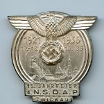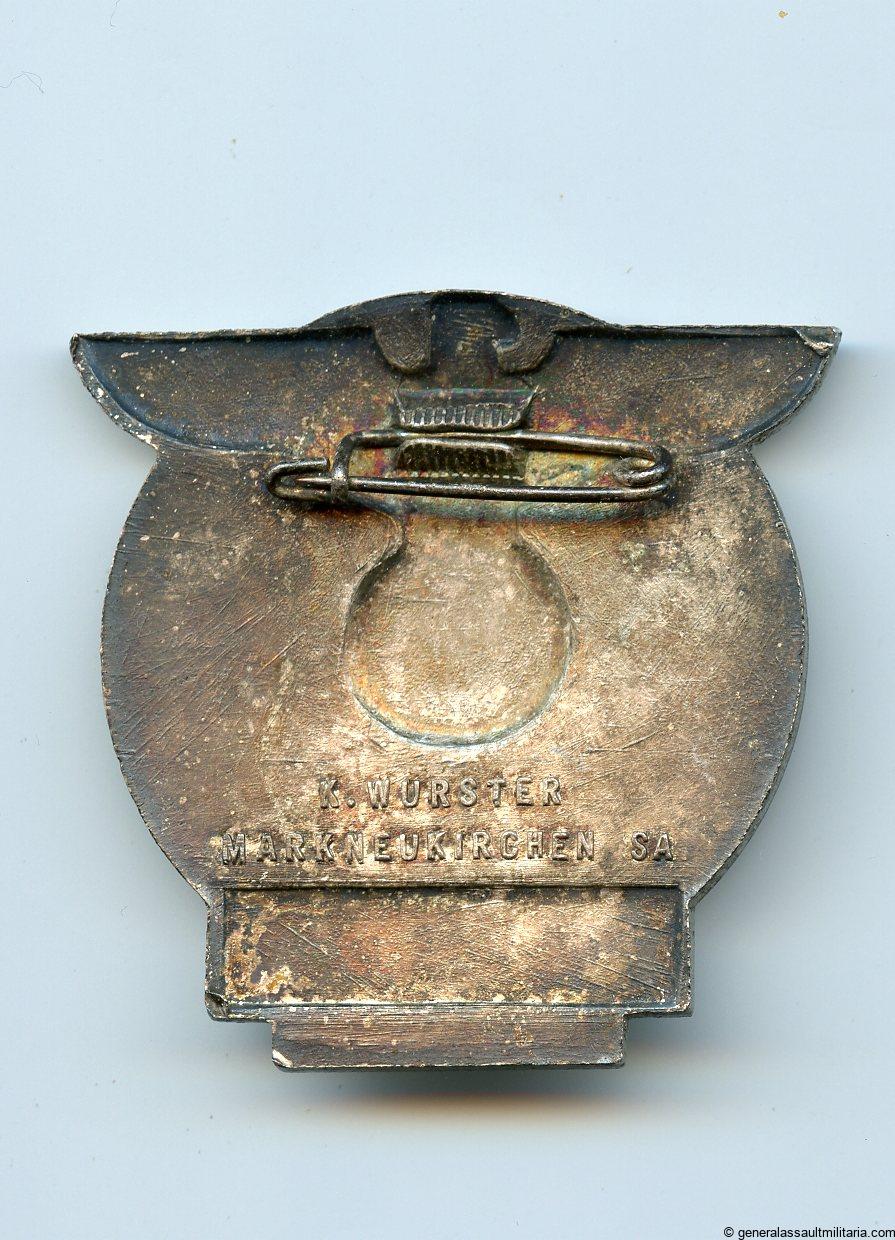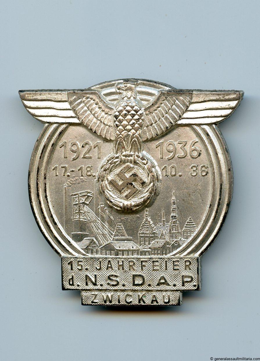 15.Jahre NSDAP Feier Zwickau – Karl Wurster, Markneukirchen. Solid zinc badge with silver finish on top. Remains in lightly worn condition with most of the bright silver finish still present on the front. Very good looking badge maker makred on the back K. Wurster. More uncommon NSDAP celebration badge.