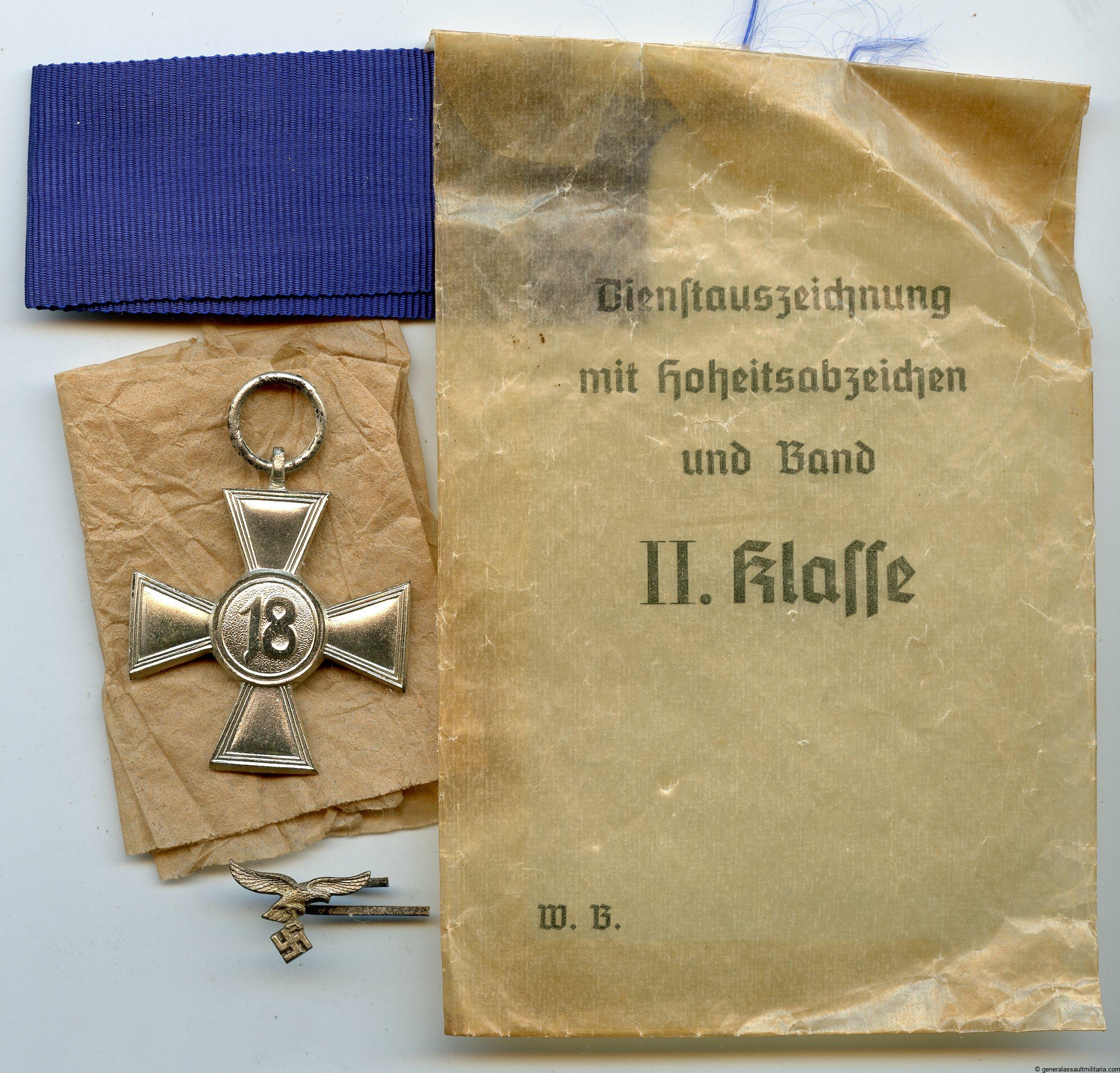 18 year loyal service medal + packet and Luftwaffe attachment. Iron medal with silver finish in near perfect condition. Comes with its original blue ribbon and tombac Luftwaffe eagle attachment for the ribbon. The very rare 2th class packet remains in good condition with some cracks and age, but nothing out of the ordinary for these fragile packets.