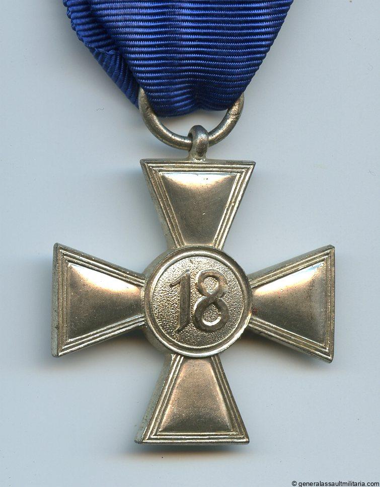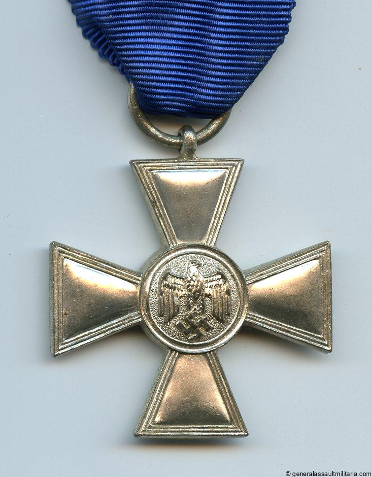18 year loyal service medal Wehrmacht – unknown maker. Steel construction medal with Wehrmacht eagle in the center of the silver plated cross design. Remains in excellent condition with near mint finish. Top example with 10cm ribbon blue service medal ribbon.