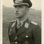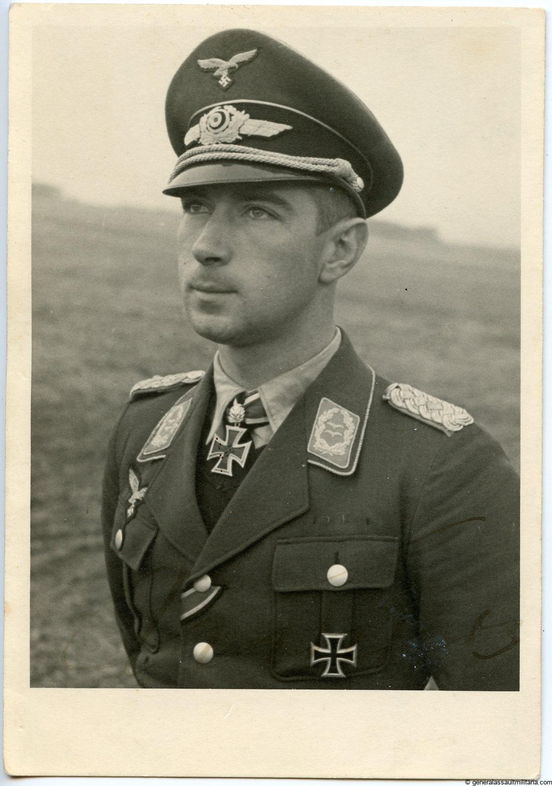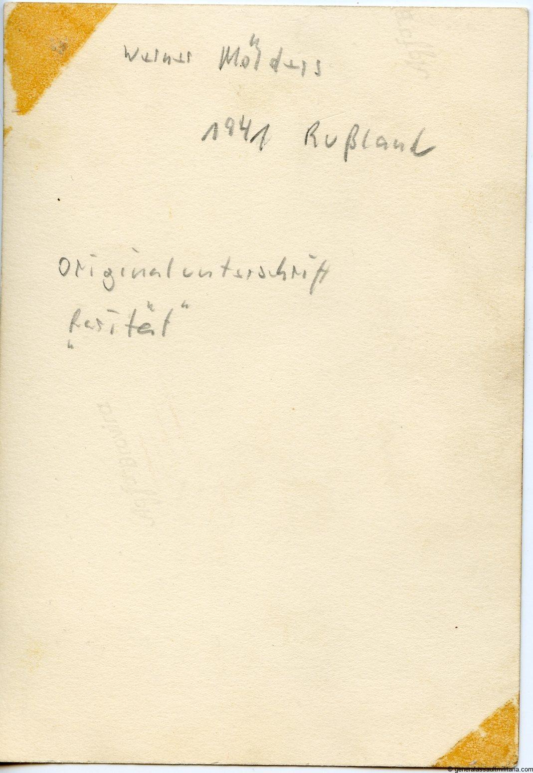 Postcard size portrait of KC holder Werner Mölders. Shows a vague pen impressed signature, I can however not confirm this is really his. Early portrait of Mölders with the KC and oak leaves in wear. The text written with a pencil is added postwar. Dated 1941 Russia. On period Agfa Brovira paper. Some small black spots near the KC, but overall it remains in very good condition and has a sharp appearance.