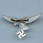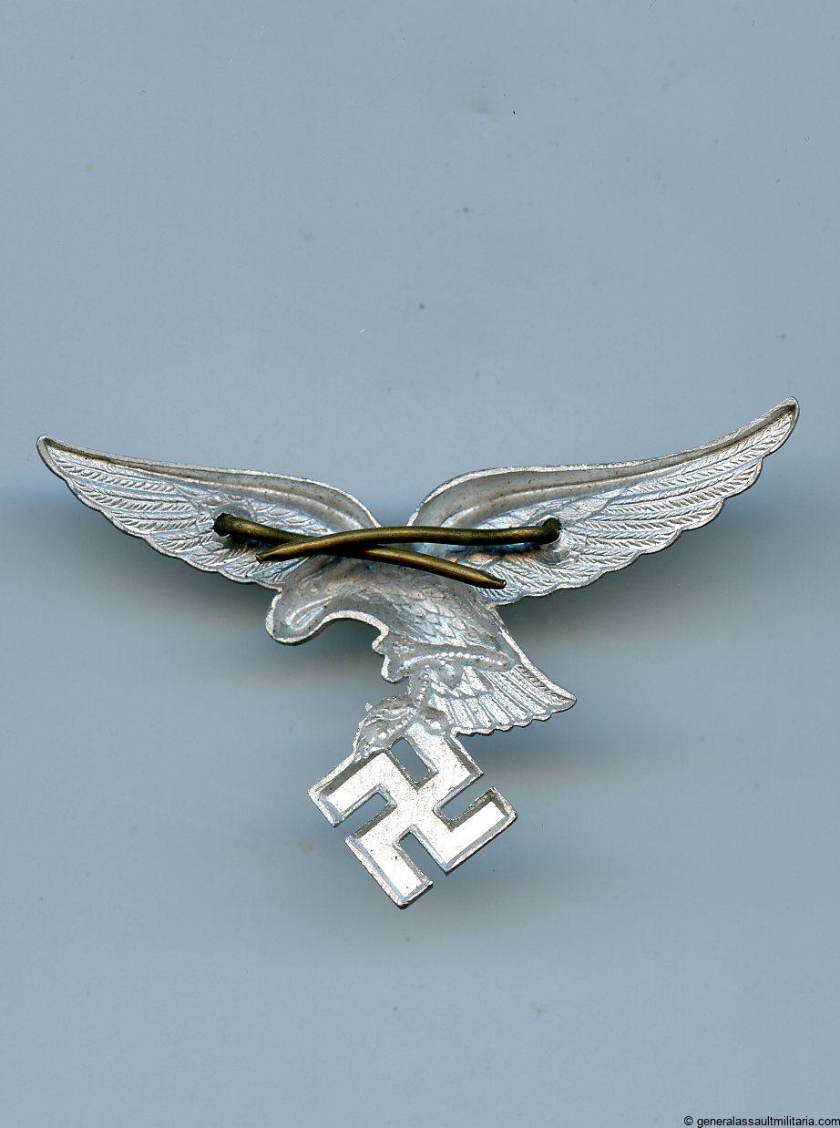 1st pattern Luftwaffe cap eagle. Hollow aluminum first pattern Luftwaffe ‘drop tail’ eagle for the Luftwaffe cap. Remains in unworn condition and has both tombac crimped prongs still intact. Very uncommon eagle that was used on the 30s Luftwaffe NCO cap. Mint example!