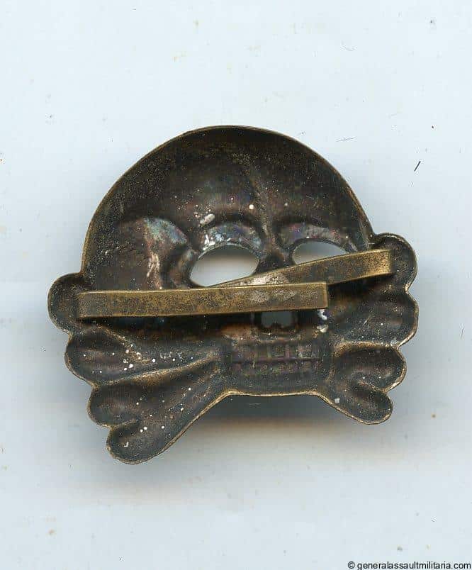1st pattern SS Danziger skull cap eagle. Tombac construction with directly soldered prongs and without makers mark. Remains in good worn condition with some of the finish remaining. Very appealing worn skull.