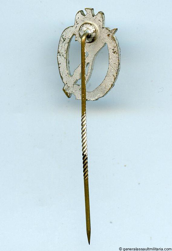 2.1cm infantry assault badge silver stickpin. Very uncommon large size tombac miniature with with thin silver finish. Remains in lightly worn condition with a great look, only the first time we had this type for sale.