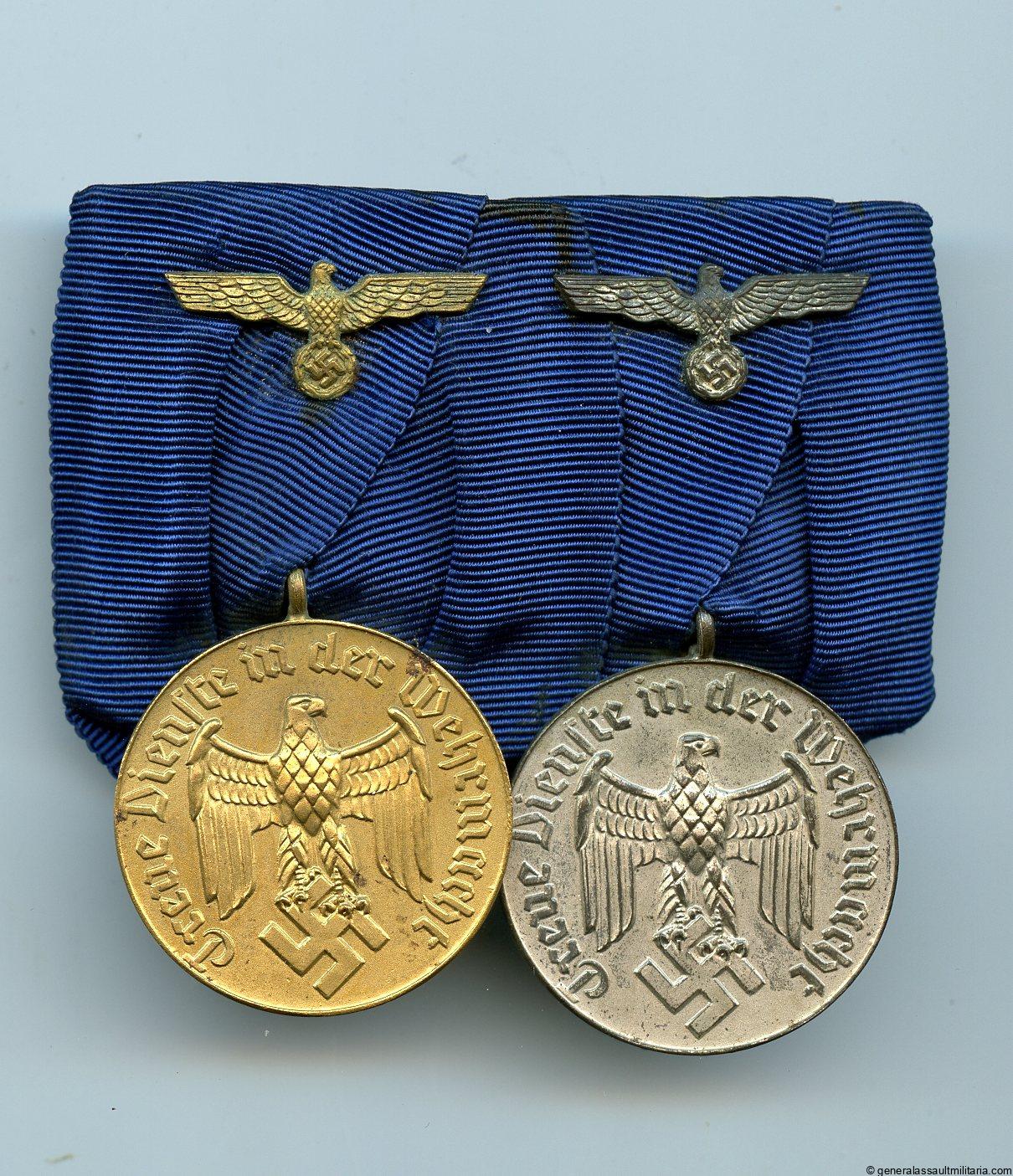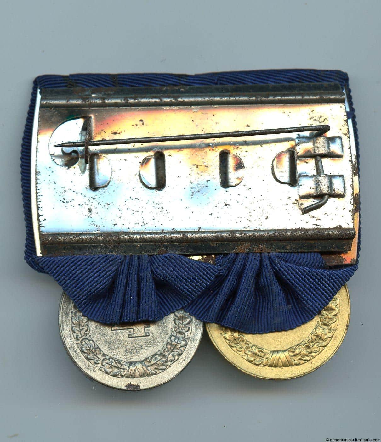 2 piece medal bar 4 + 12 year Heer service medal. 4 and 12 year steel construction Heer loyal service medals mounted too a two piece medal bar. Shows the Heer attachment eagles on the ribbons and remains in very good lightly used condition.