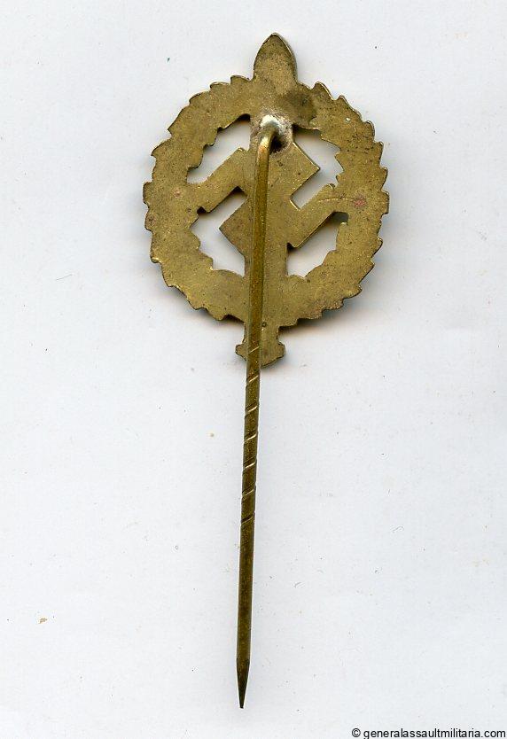 24mm SA sports badge in gold stickpin. Rare Stickpin with light gold tone finish, tombac construction and directly soldered pin. Retains most of the the gold finish. Very uncommon large size!