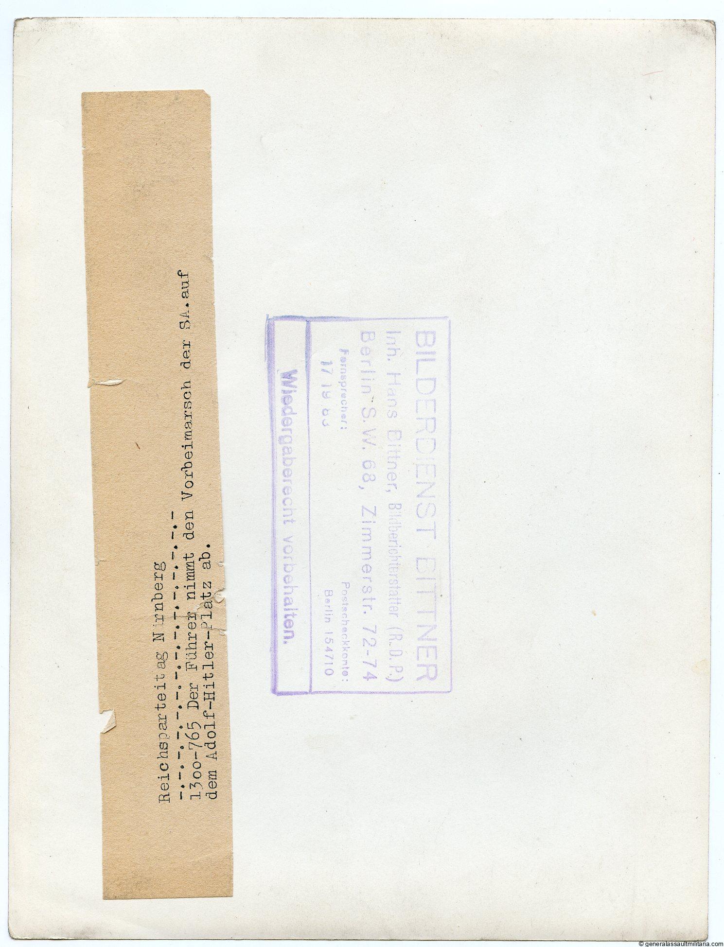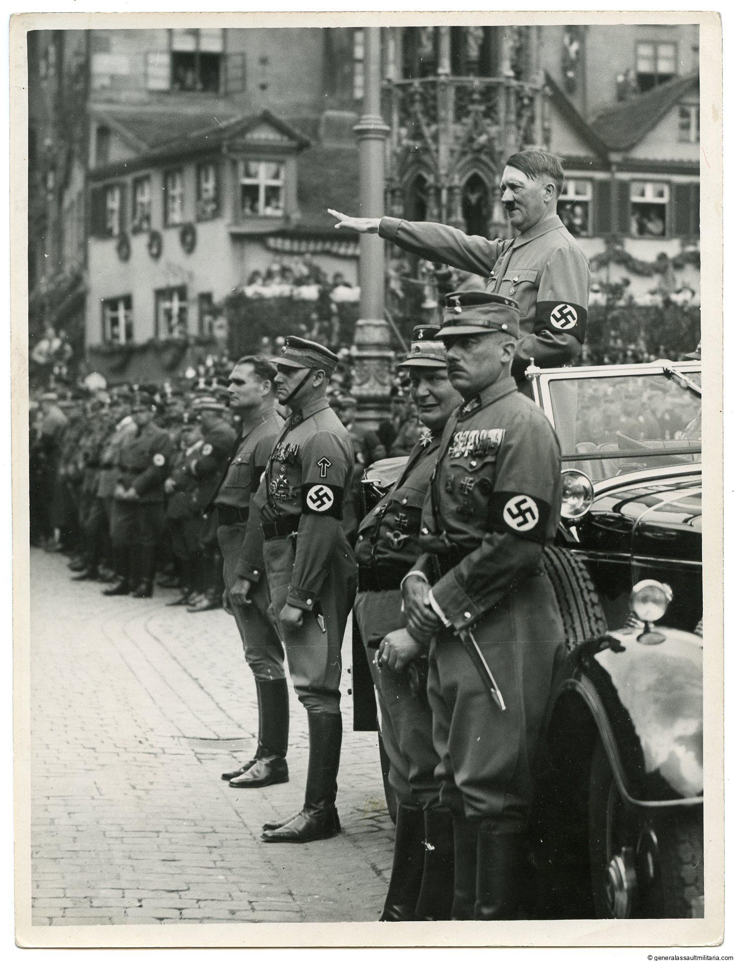 Large size 24x17cm press photo of Hess, Göring and Hitler in his Mercedes. Very sharp shot with Reichsparteitag Nürnberg on the reverse. One of the best looking Adolf Hitler photos we have had on offer, especially in this large size. From the famous Nürnberg parades.