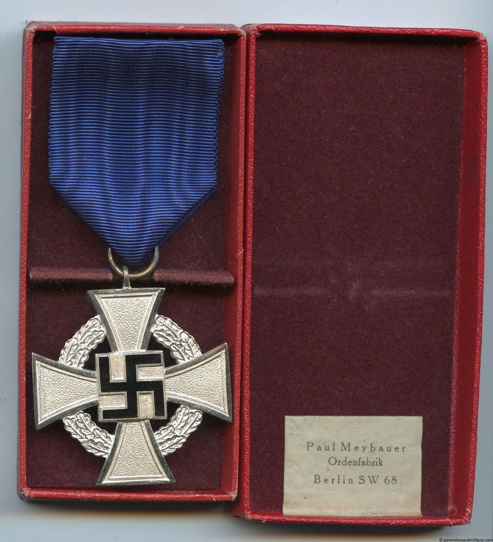25 year loyal service medal – Paul Meybauer, Berlin. Tombac silver plated medal with enamel inlay and setup device on the ribbon. Comes with matching case with Paul Meybauer marked tag. Good set in excellent condition.