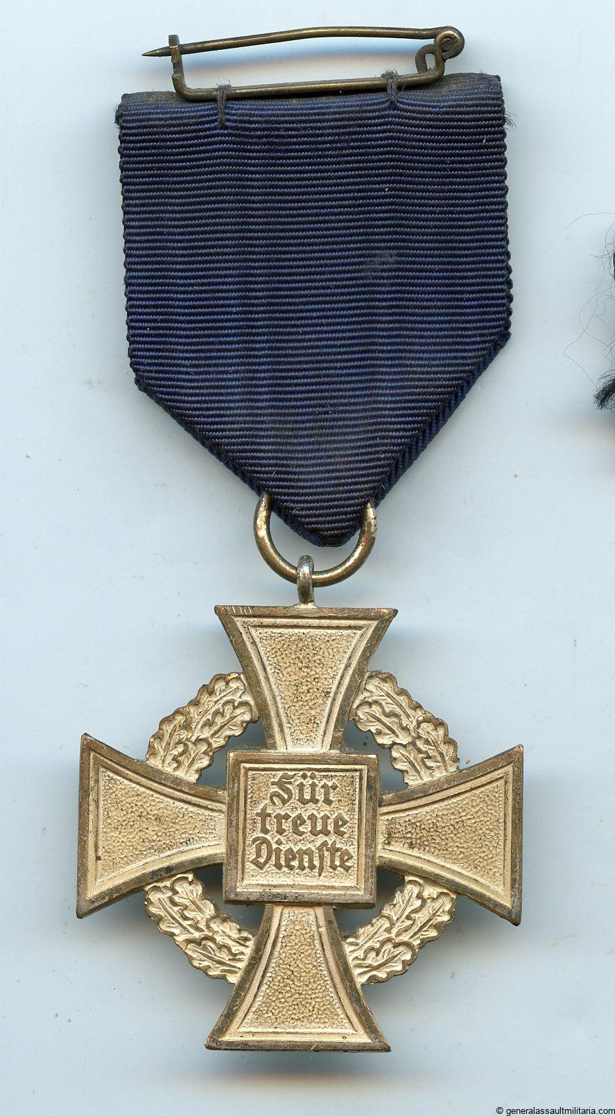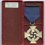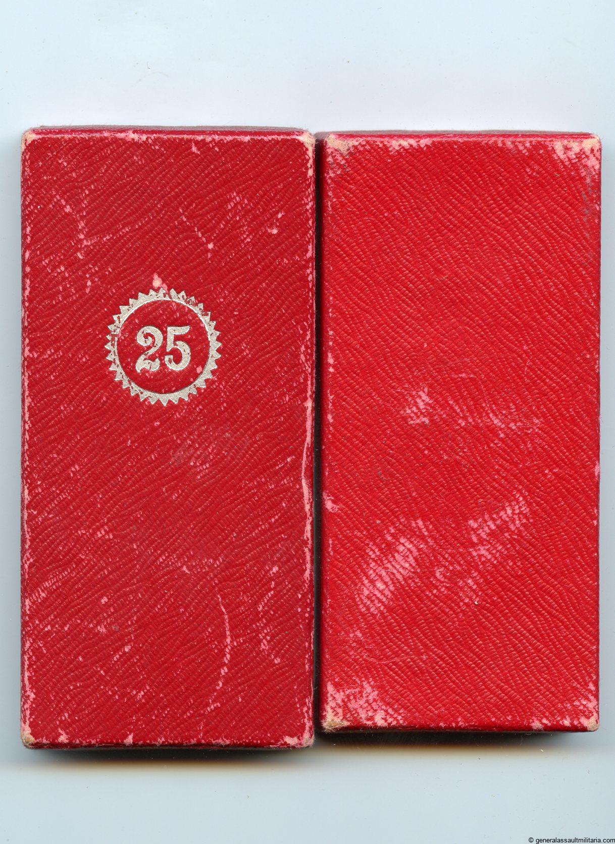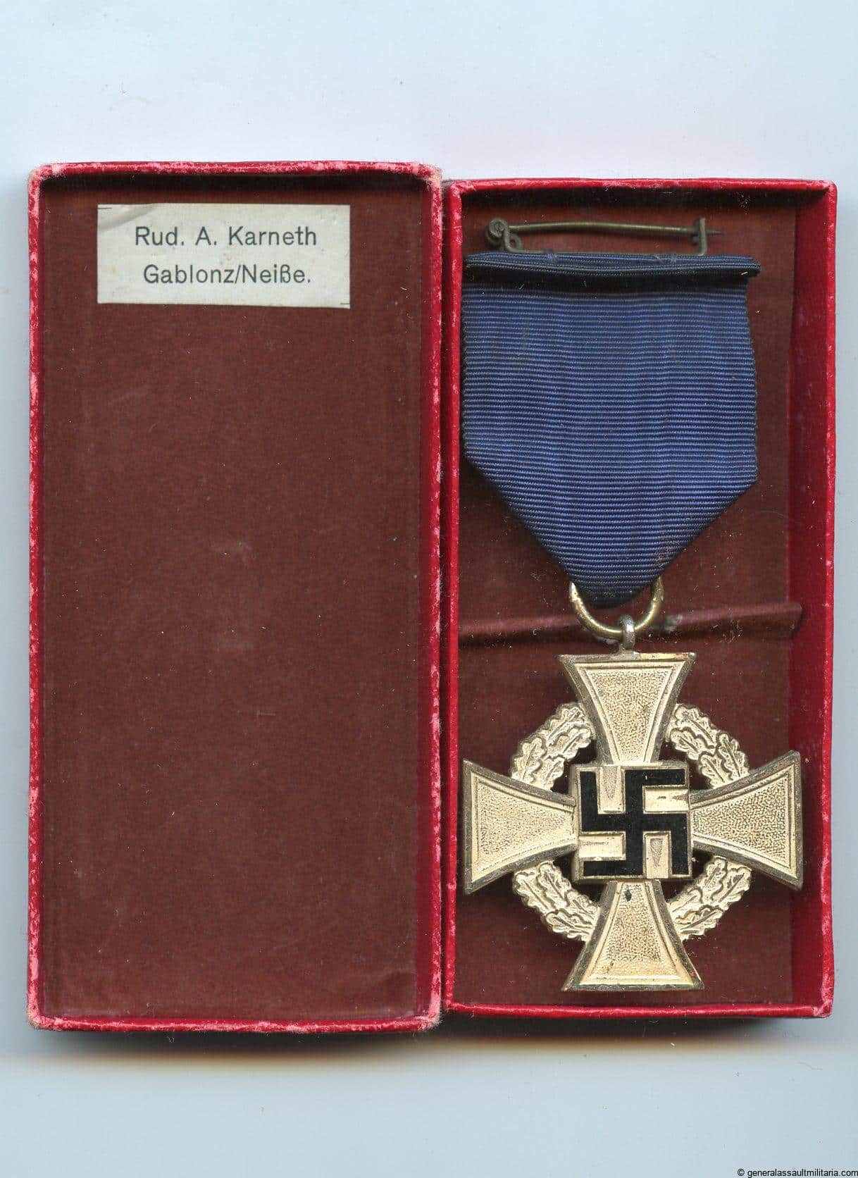 25 year loyal service medal – R. Karneth, Gablonz. 25 year Tombac medal with enamel swastika and frosted silver finish and polished edges. Shows some age(wear) to it and remains in good condition overall. Comes with matching RK marked case in good condition with some of light scratches, corner remain undamaged.