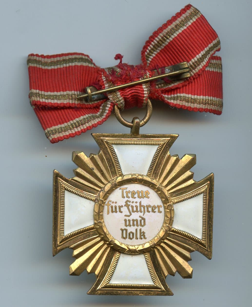 25 year NSDAP service medal – Wilhelm Deumer, Lüdenscheid. Tomba construction medal with white enamel inlay and gilded surface. Beautifully sharp example with RZM mark 19 in the ring for Deumer and comes attached with the very rare female mounting ribbon. Remains in stunning near mint condition with only the slightest wear.