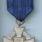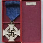 25 years service medal with box – C.F. Zimmermann, Pforzheim. Tombac medal with silver finish and enamel inlay. Remains in mint condition and has the setup device attached to the blue ribbon. Comes with matching box that remains in very good condition, only one corner is slightly split. Shows the C.F Zimmermann tag on the inside of the top.