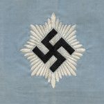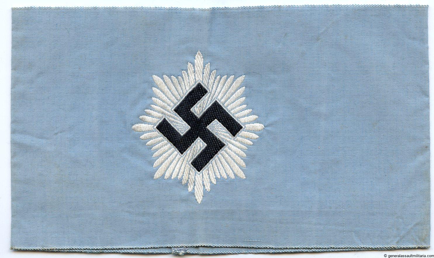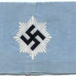 RLB Armband. 2nd pattern ‘Reichsluftschutzbund’ armband with woven white star and swastika on top. Remains in unworn condition and only has some light staining on the back. Nicely preserved example. Maker marked Ges. Gesch. H&F that is well known for this type of weave.