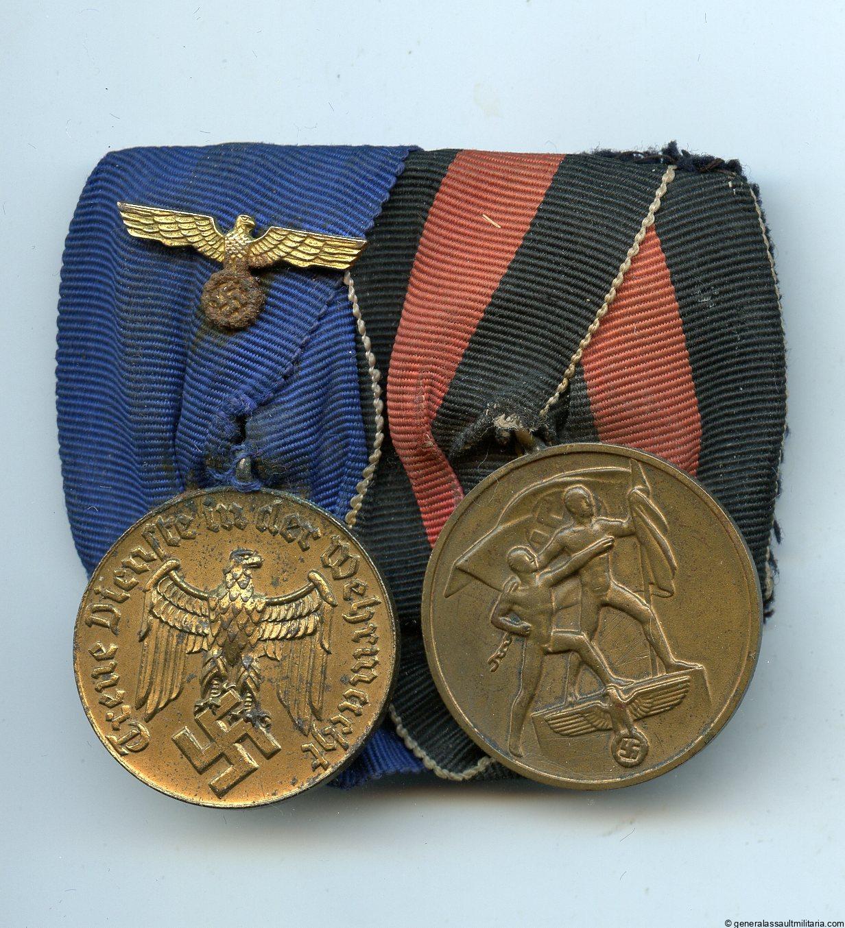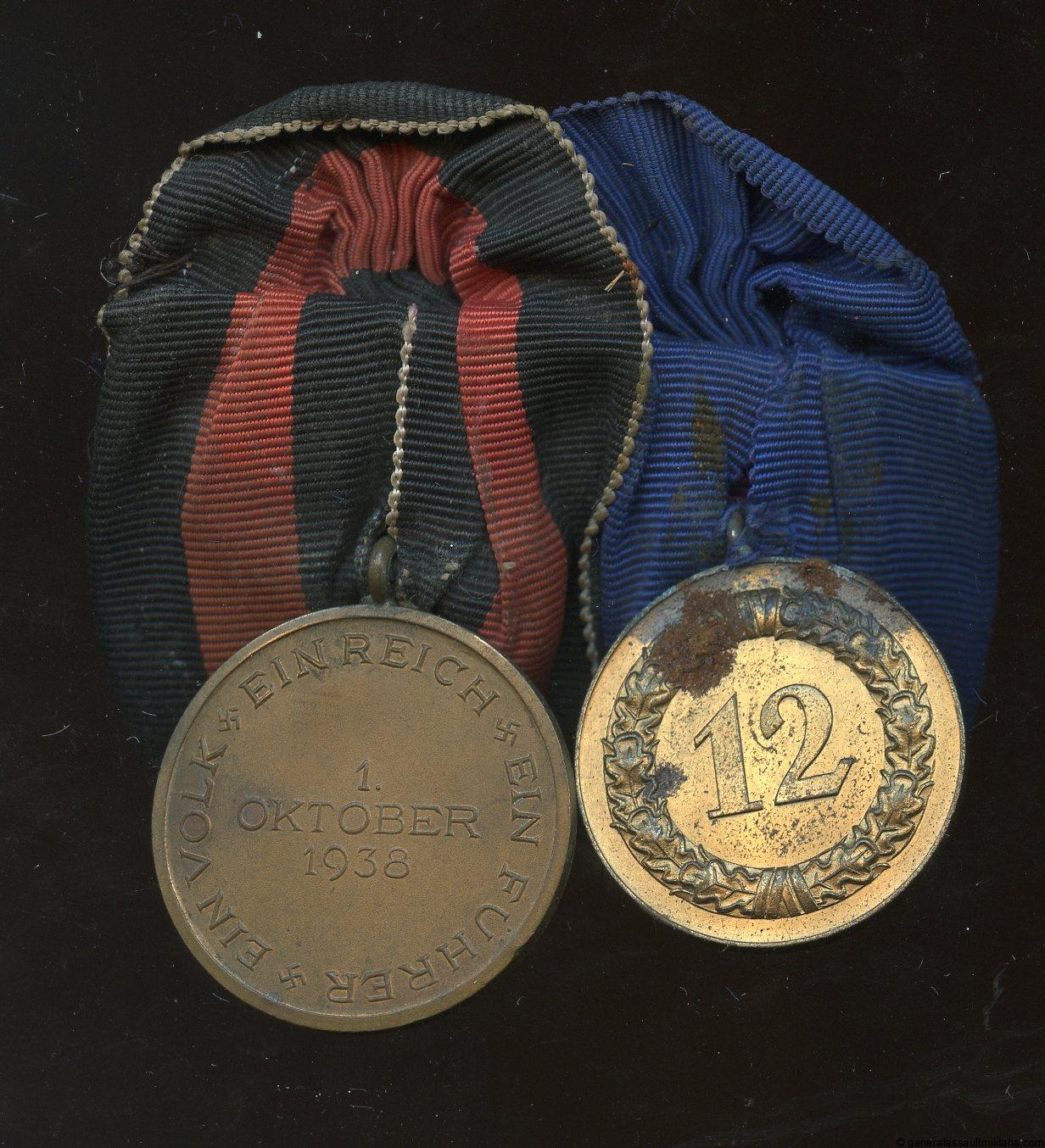 Two piece medal bar with 12 year Heer service medal and Sudetenland annexation medal. Remains in worn condition with good age to both medals, the 12 year having some rust near the eagle attachment and on the reverse of the medal. Not the best condition but still an interesting and difficult to find combination.