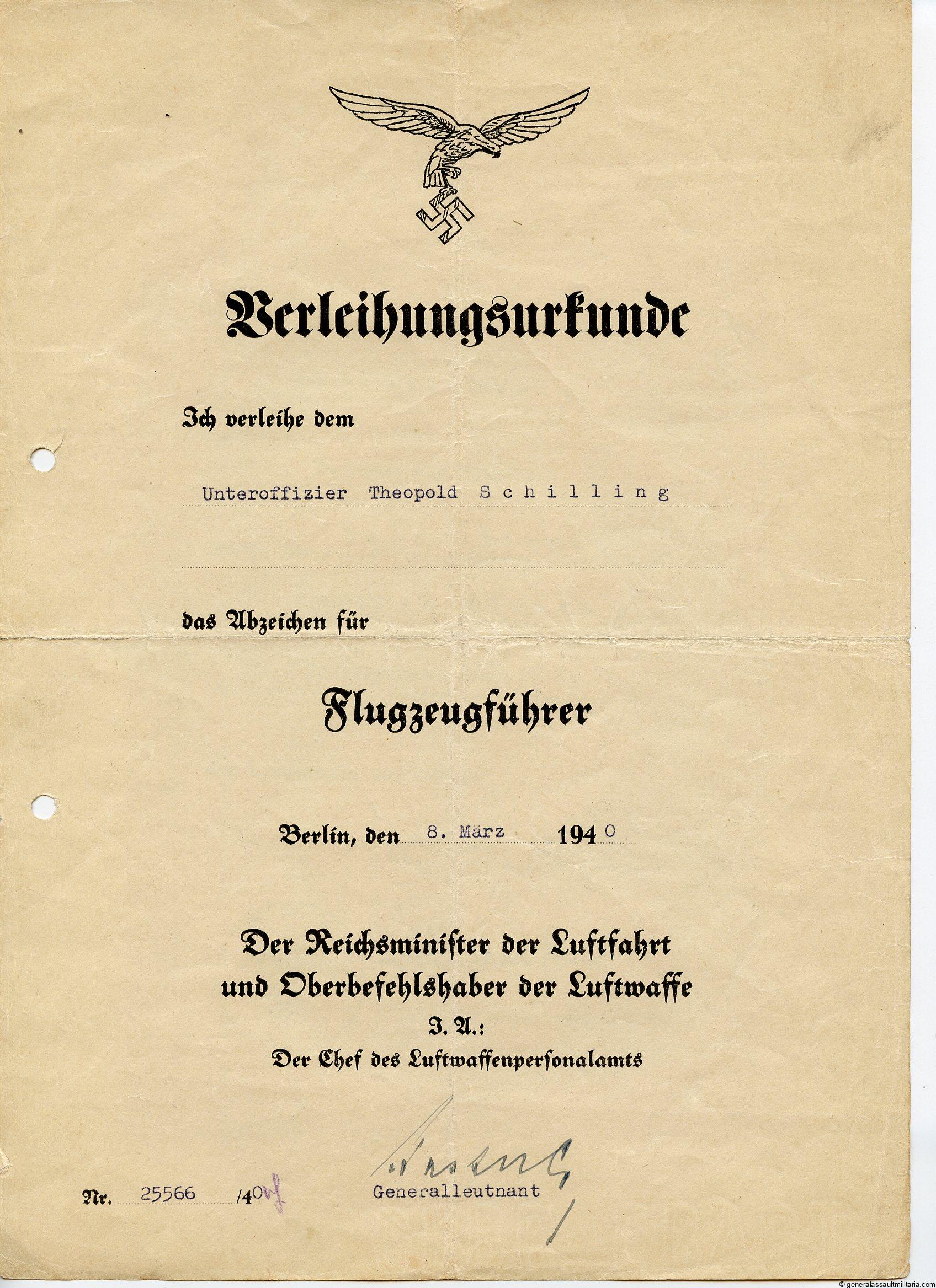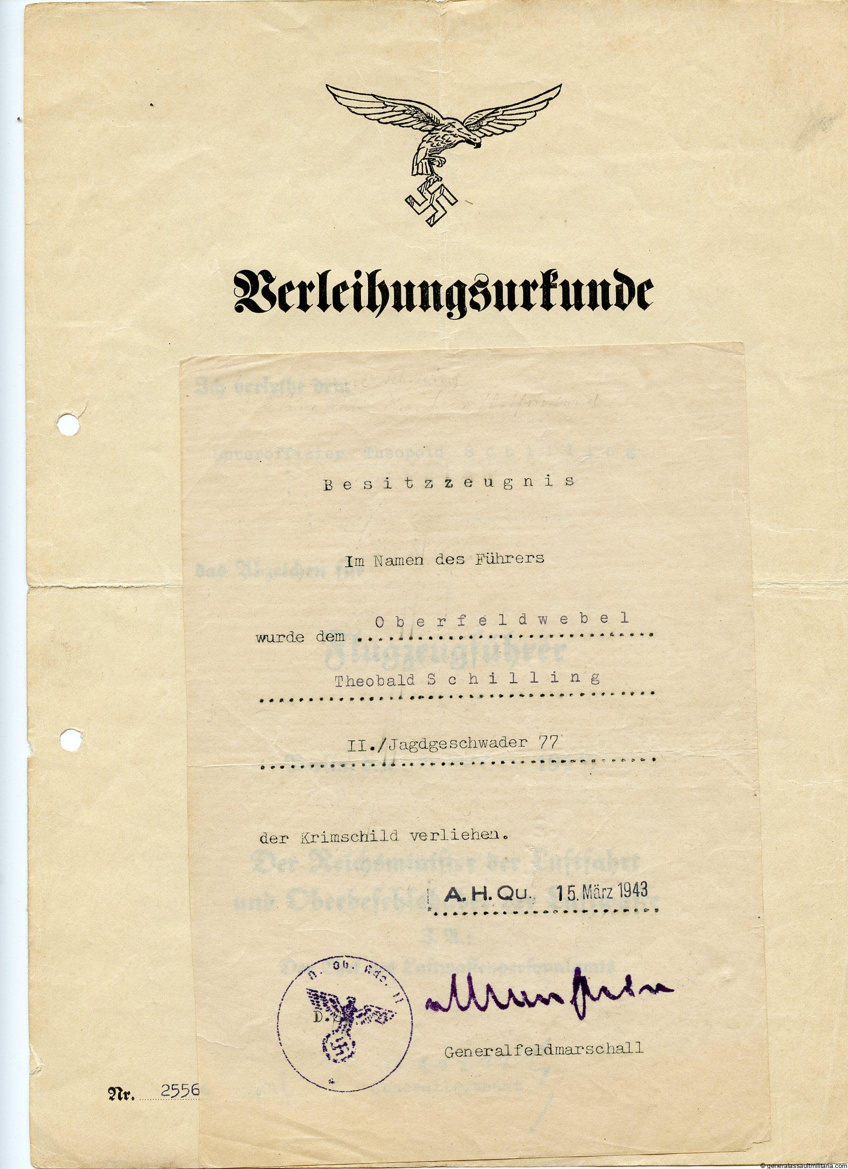 2x award document Theobald Schilling jagdgeschwader 77. Consists of Schilling his pilot badge award document from 0.8.03.1940 and his Krim shield award document from when he was with the II./Jagdschwader 77 awarded on 15.03.1943. Interesting small set from a unit that was equipped with fighter planes like the BF.109. Krim remains in near mint condition and the pilot badge document shows some wear and age to it.