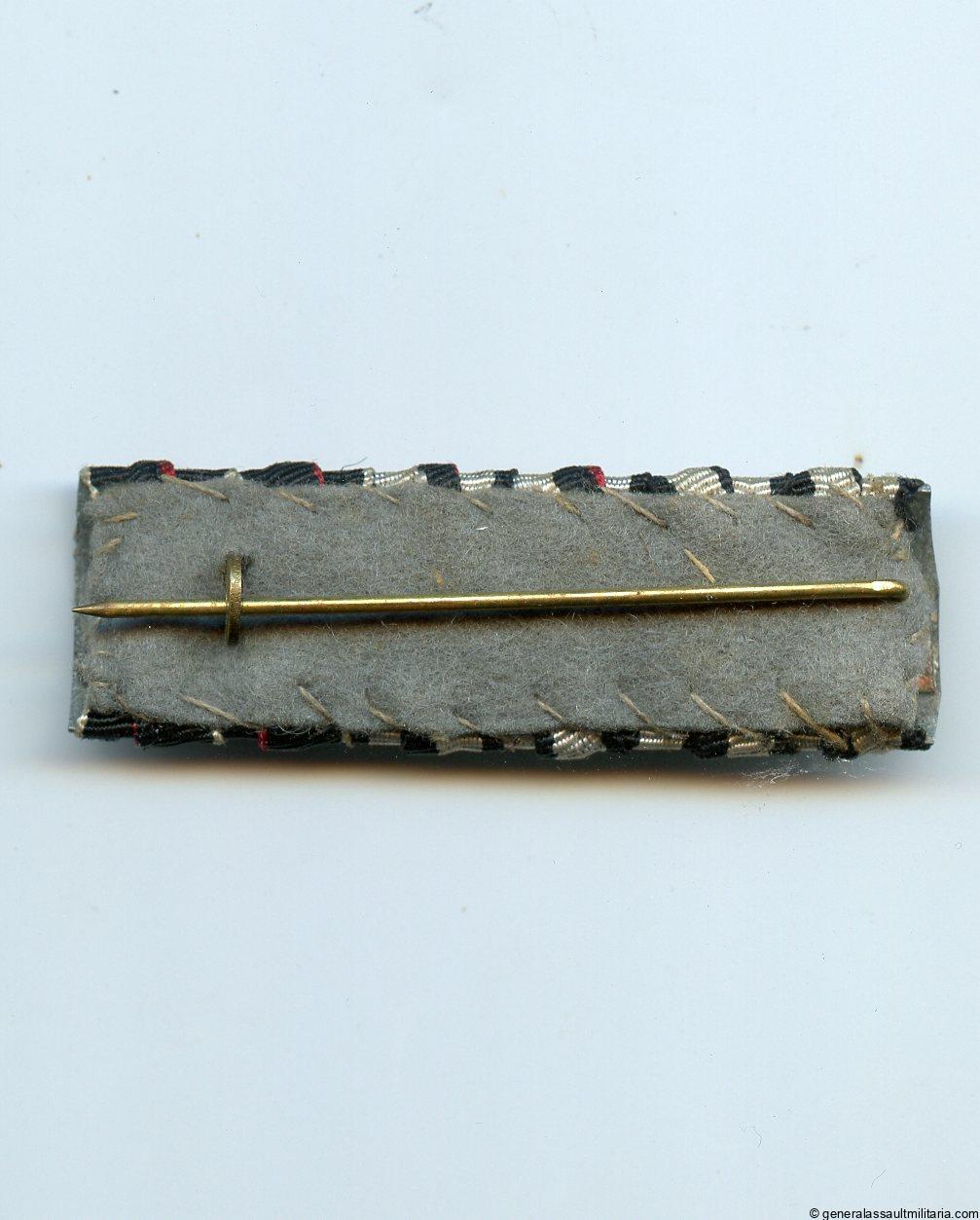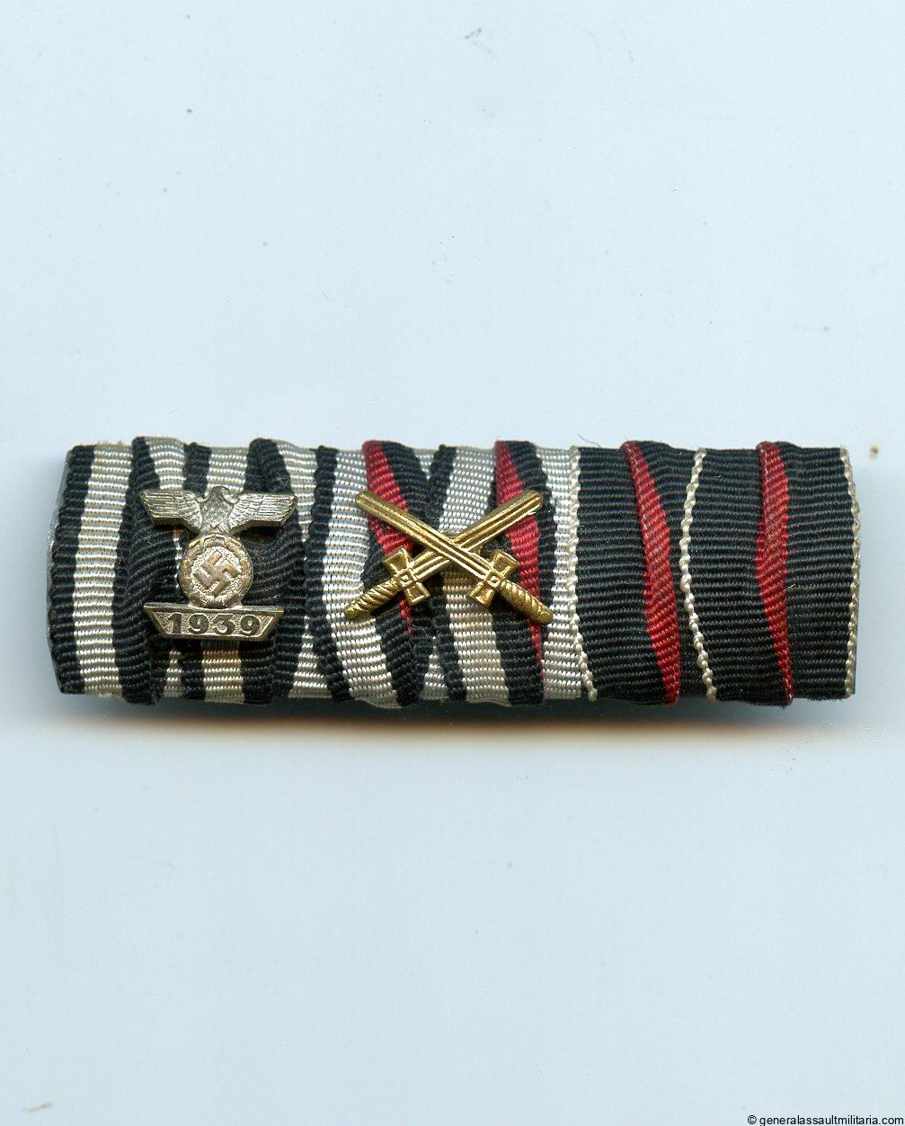 3 piece ribbon bar with Ek2 repeat clasp attachment, Hidenburg cross and Sudetenland medal. Remains in lightly worn condition with grey backing and Wurttemberg style mounting of the ribbons. Beautiful example.