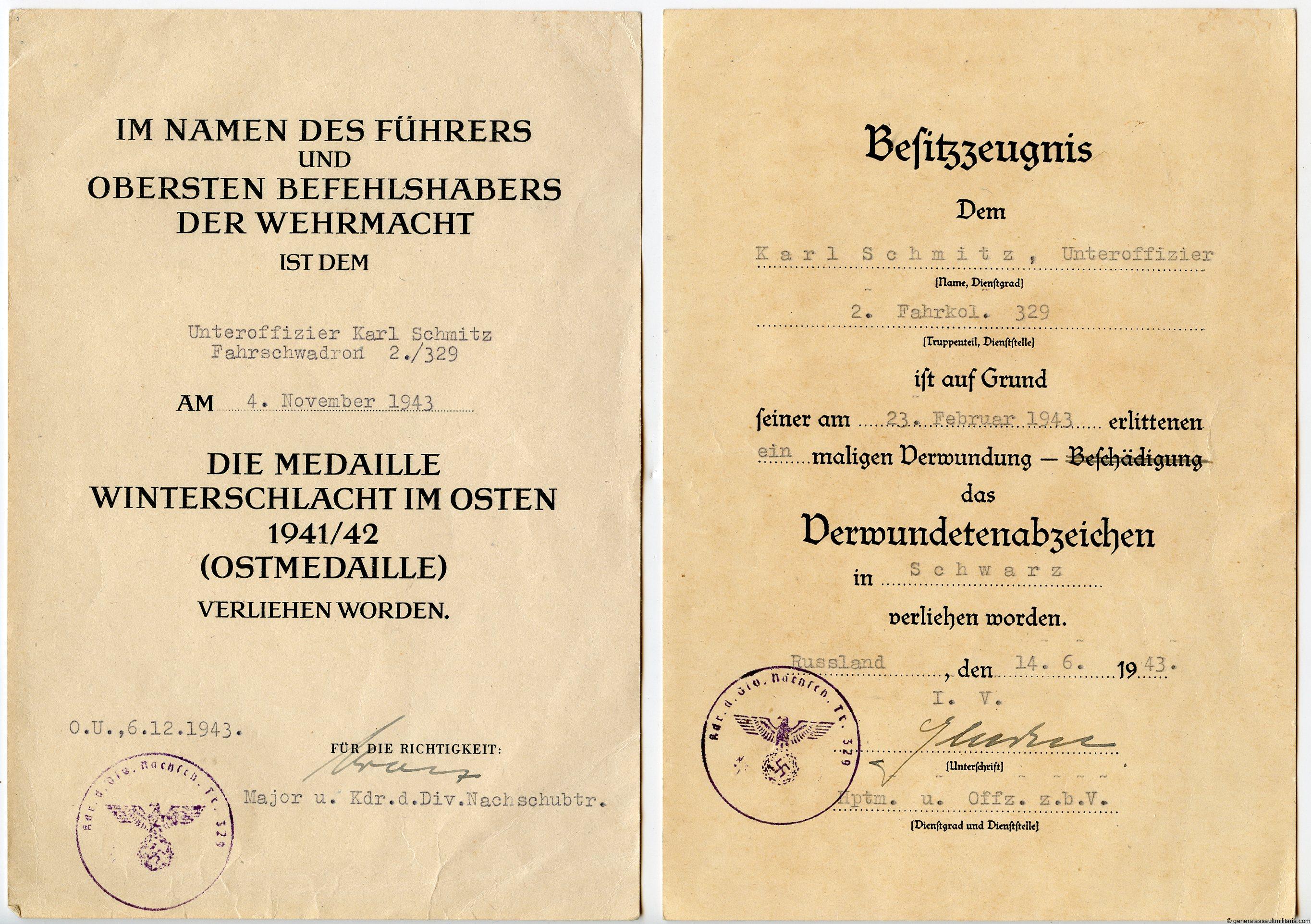 3x award certificate Fahrkolonne 329. Wound badge in black, Ost medal and war merit cross 2nd class with swords to Unteroffizier Karl Schmitz. Remain in good condition. All dated 1943.