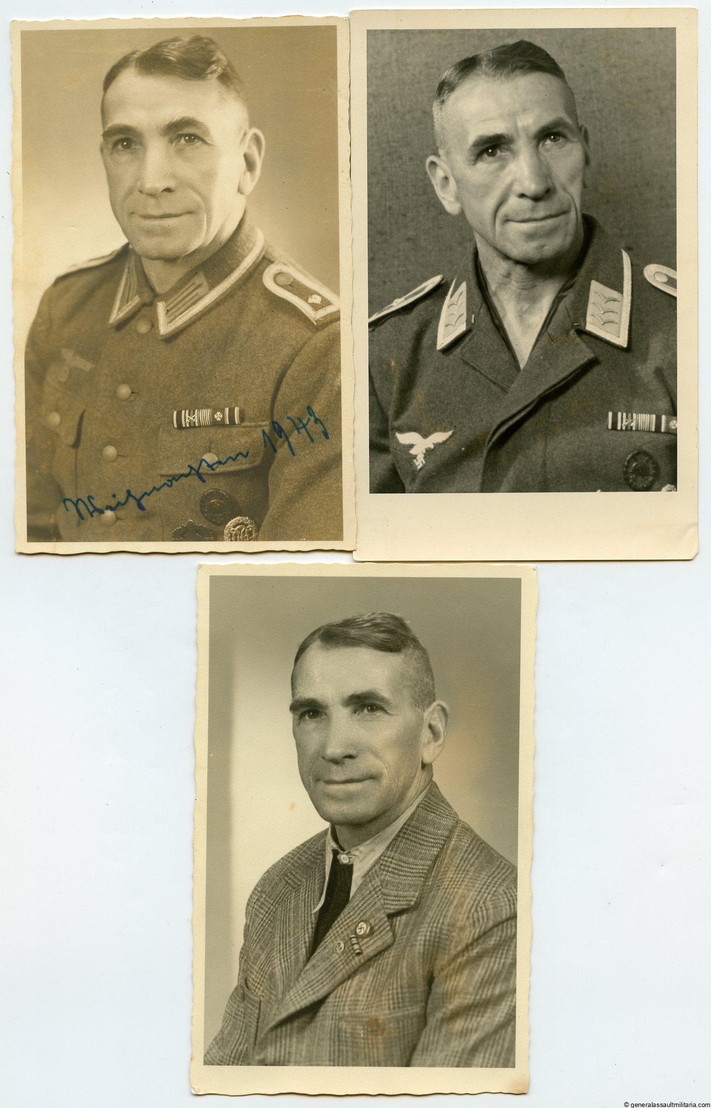 3x portrait Civlian,Heer, Luftwaffe. Very interesting and rare set of 3 portrait of a quite highly decorated veteran that served his whole life, WW1 and WW2. All three remain in excellent condition. 1st time I have seen such a set. Great quality.